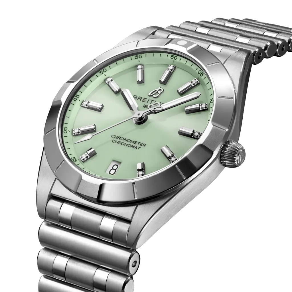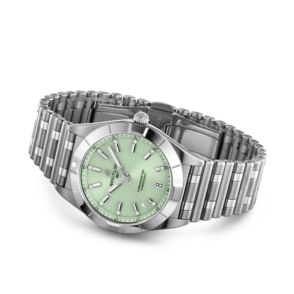 The Breitling Chronomat Automatic 32 reference A77310101L1A1 has a stainless steel case paired with a matching Rouleaux bracelet. The dial is Green. Inside ticks the SuperQuartz caliber Caliber 77.