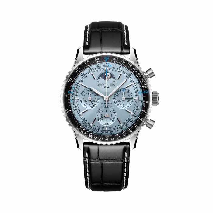The Breitling Navitimer B19 PB1920251C1P1 debuted in 2025. This Navitimer has a stainless steel case with platinum bezel,s which houses T201 - a self-winding movement with chronograph and perpetual calendar. The dial is ice Blue. This edition bridges past and future: a steel case, platinum bezel, ice-blue dial, and the remarkable B19 movement—an automatic chronograph with a perpetual calendar. A watch built from heritage, made for today.