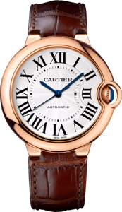 The Cartier Ballon Blue line was introduced in 2007. It features a smooth, pebble-like case. One of its signature elements is the recessed & protected crown and the 'dent' it causes in the dial. Reference WGBB0009 has a pink gold case and a silver dial. It is powered by the self-winding caliber 049 (no date) and fitted with a leather strap.
