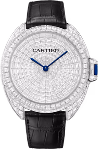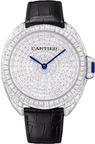The Clé de Cartier was introduced at SIHH 2015. The case, available in a number of sizes, has a soft profile somewhere in between 'round' and 'cushion'. While at first glance the look is not unlike watches from the late sixties and early seventies, both details and finish are distinctively modern and Cartier. It's name is a reference to the clever locking system of the crown - the 'key'. Reference HPI00938 has a white gold case set with 180 baguette-cut diamonds totalling 8.70 carats and 48 scissor-cut diamonds totalling 4.45 carat. The white gold dial is set with 224 baguette-cut diamonds totalling 6.60 carats. The white gold folding buckle is set with an additional 37 baguette-cut diamonds totalling 0.85 carats.