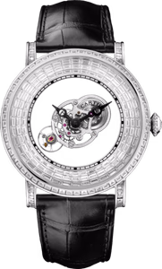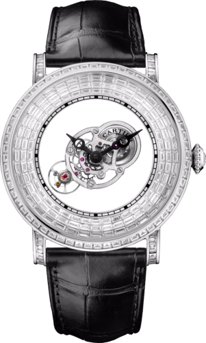 With its round case and straight lugs, the Rotonde de Cartier is one of the brand's more traditional designs - while retaining many Cartier signature elements. This collection consists primarily of watches with added complications. The Cartier Rotonde Astromystérieux was introduced at SIHH 2016. In a next-level interpretation of the classic 'mystérieuse' watches not only the hands, but also a large part of the movement, seemingly float in space. The case measures 43.5mm across and is made of platinum, with the bezel and lug set with 84 baguette-cut diamonds totaling 2.97 carats, the beaded platinum crown set with a brilliant-cut diamond of 0.14 carats, and the platinum dial set with 120 baguette-cut diamonds totaling 3.64 carats. An additional 37 baguette-cut diamonds totaling 0.85 carats are found on the folding buckle.