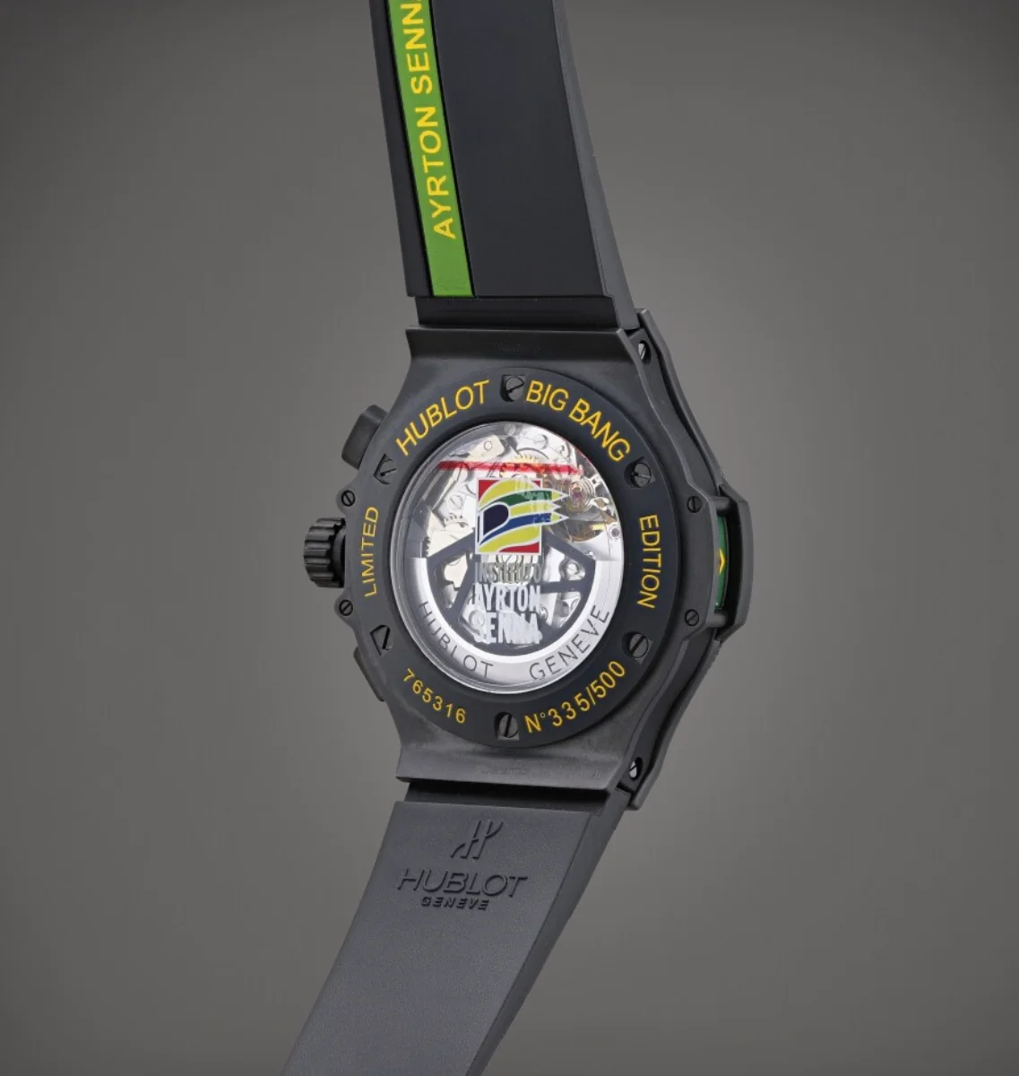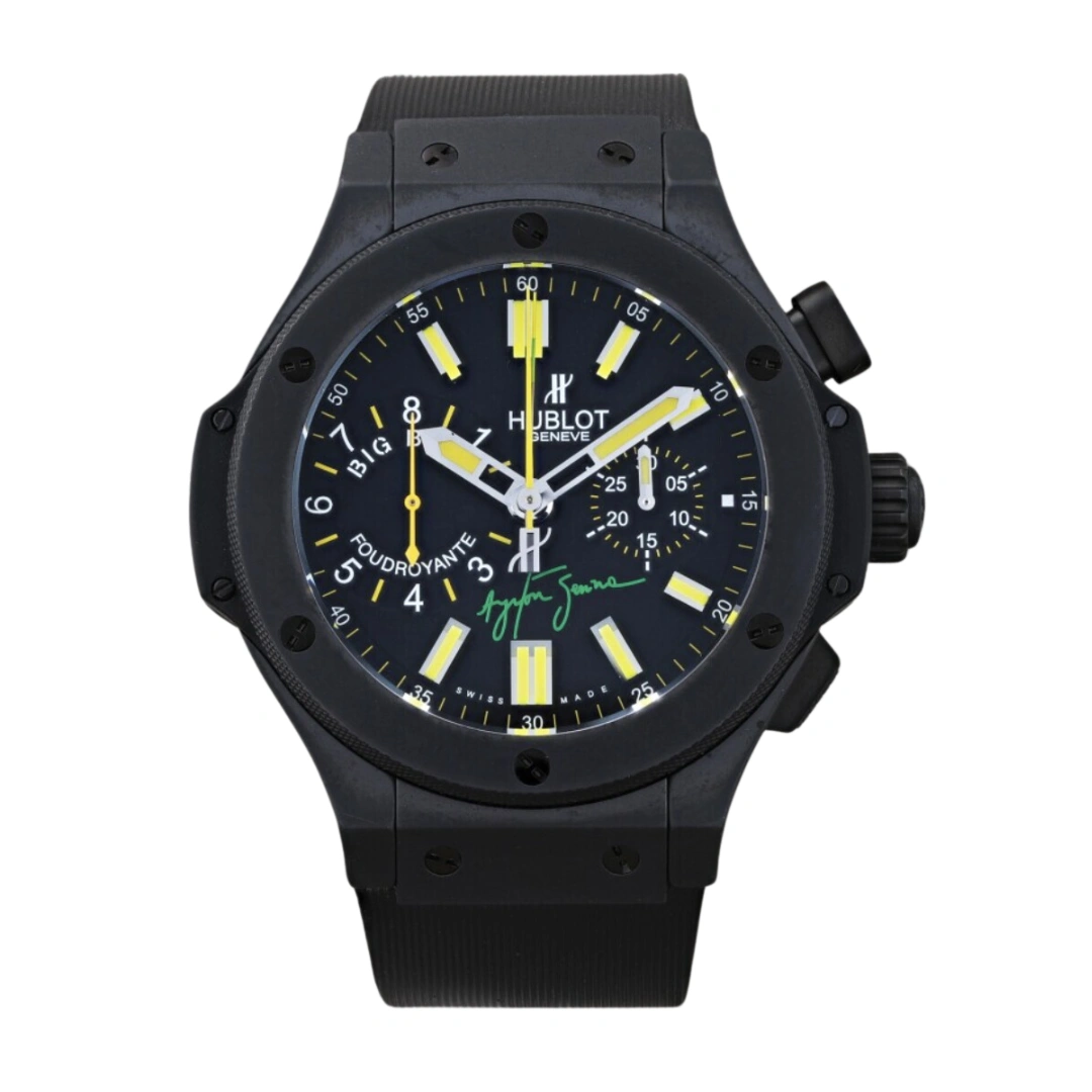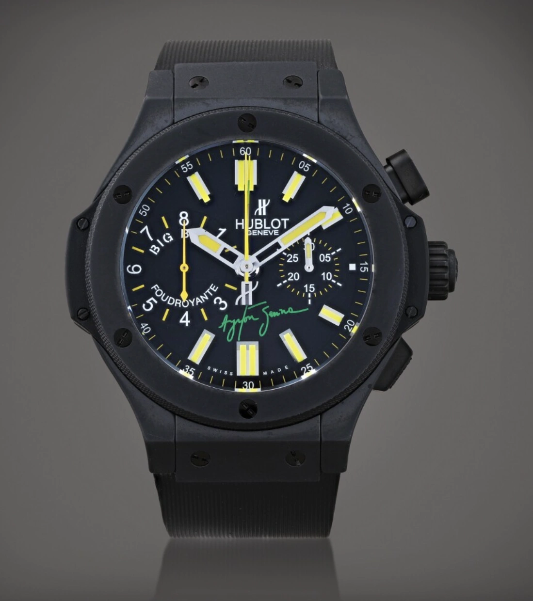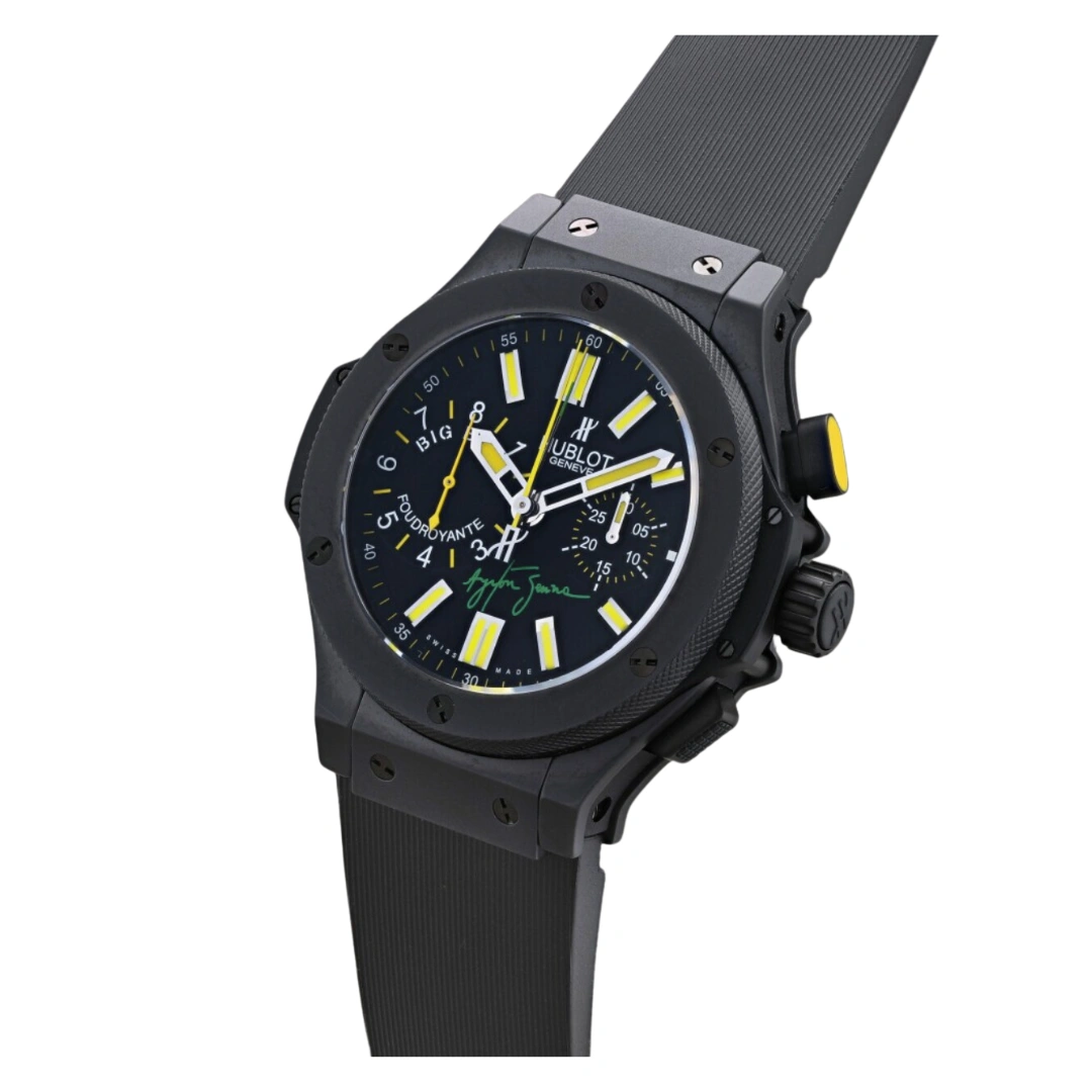 Big Bang, Ayrton Senna Foudroyante limited edition of 500 pieces. Ayrton Senna was one of the most gifted racing drivers of all time. Tragically killed in an accident at the San Marino Grand Prix when he was 34, Senna made his name with his terrific skill, three world championships and notorious rivalries, and his legend endures to this day.