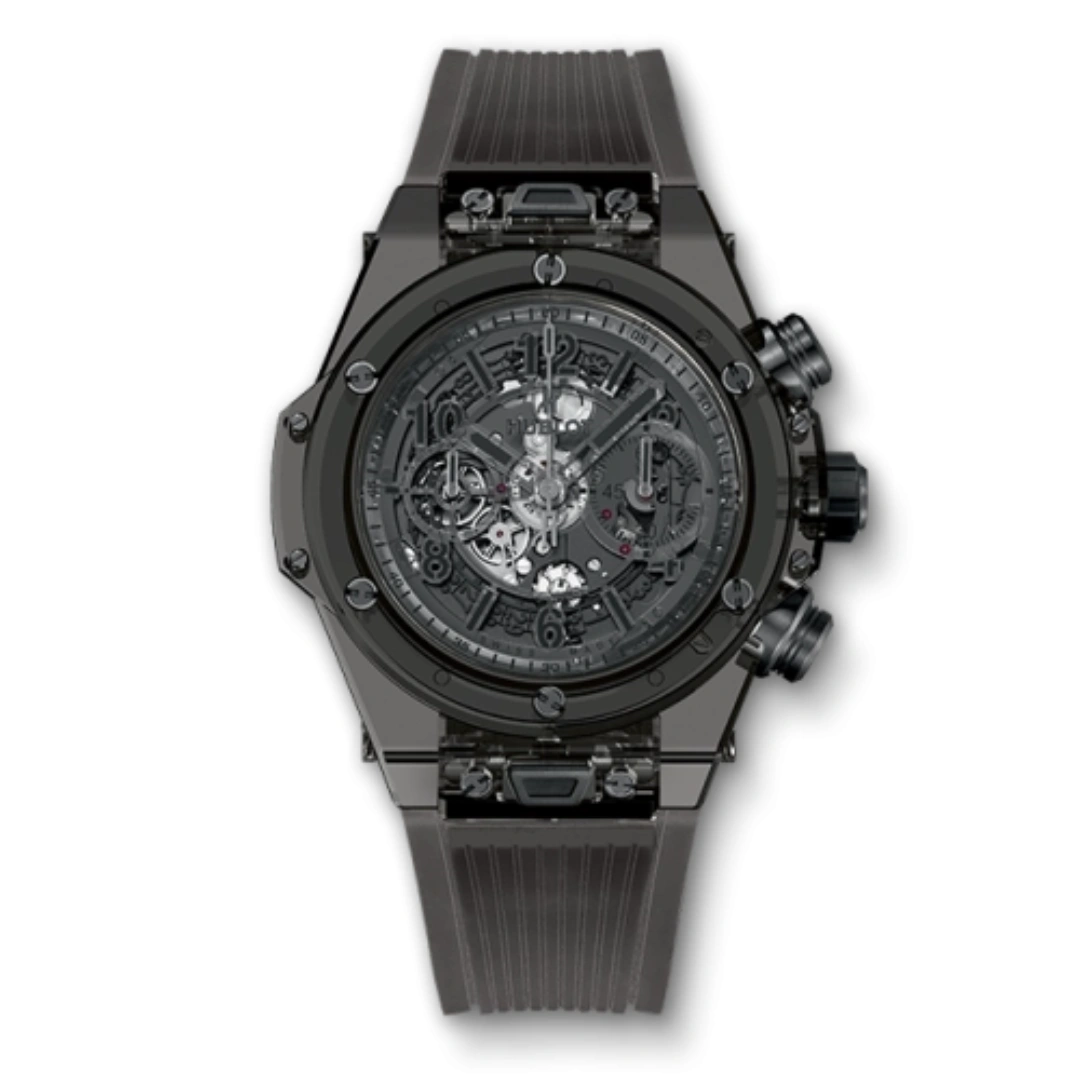 Introduced in 2016 as a limited edition of 500 pieces, the Big Bang Unico All Black Sapphire features a case made of black-tinted sapphire glass. It is powered by the 'Unico' caliber HUB1242, which can be seen through the the 'smoked' resin dial.