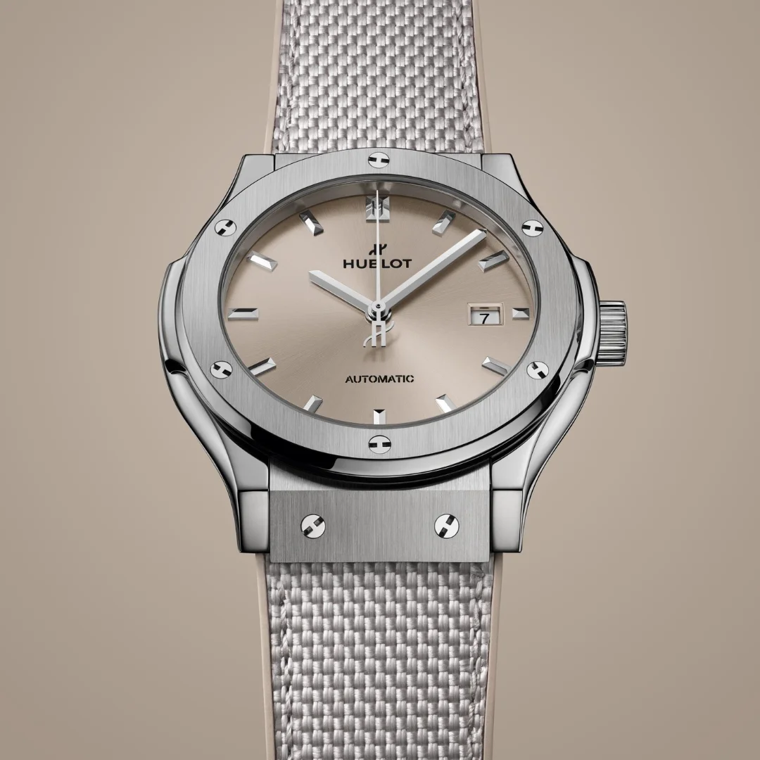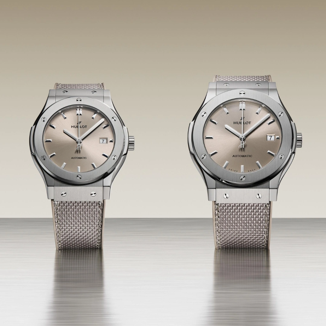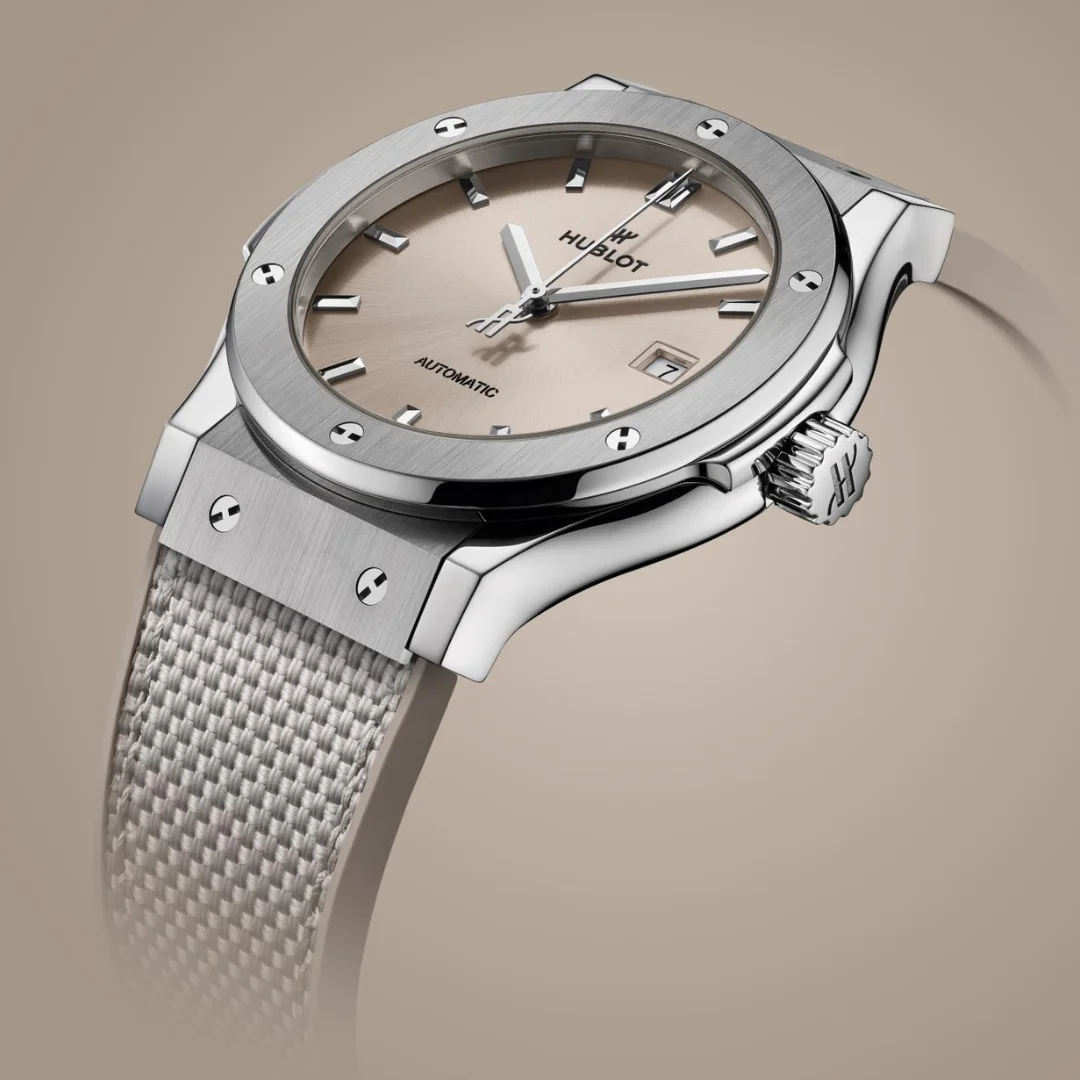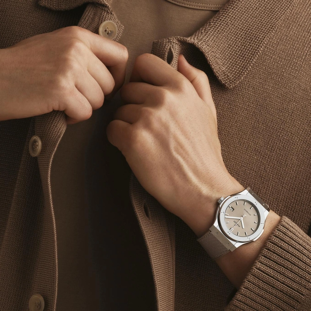 Hublot Classic Fusion Essential Taupe Ref. 542.NX.4610.NR.HEC25 . Polished and Satin-finished Titanium Case in 42mm and 45mm available. HUB1110 Self-winding Movement with a 48 hours power reserve. Taupe rubber and Taupe fabric strap. Stainless Steel Deployant Buckle Clasp. Water resistance 50m or 5 ATM