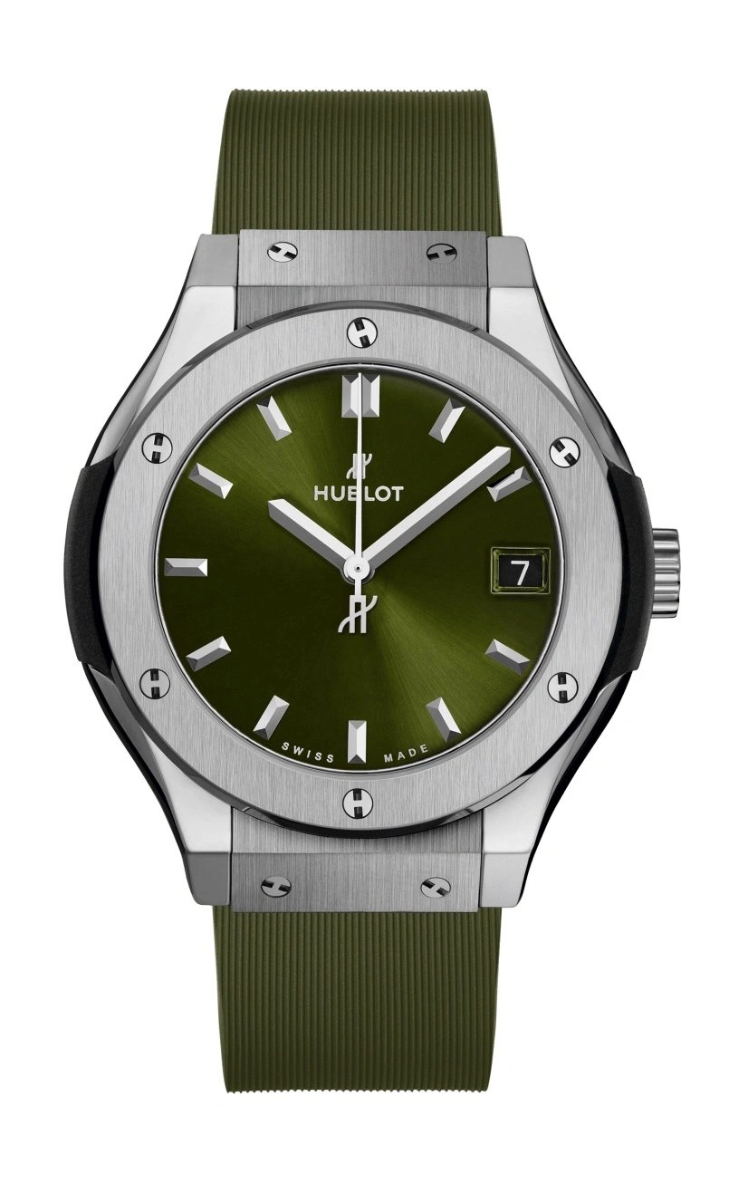The Hublot Classic Fusion 511.NX.8970.RX has a titanium case of 45.00mm, which houses the self-winding caliber HUB1112. The dial is Green.