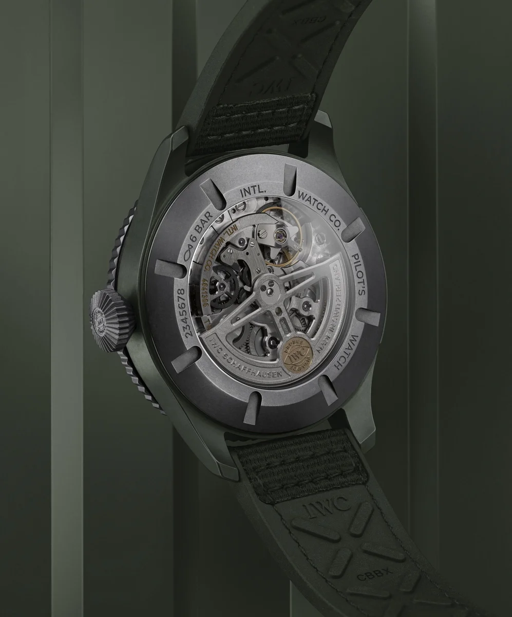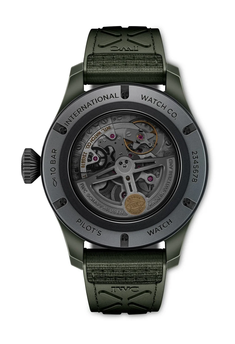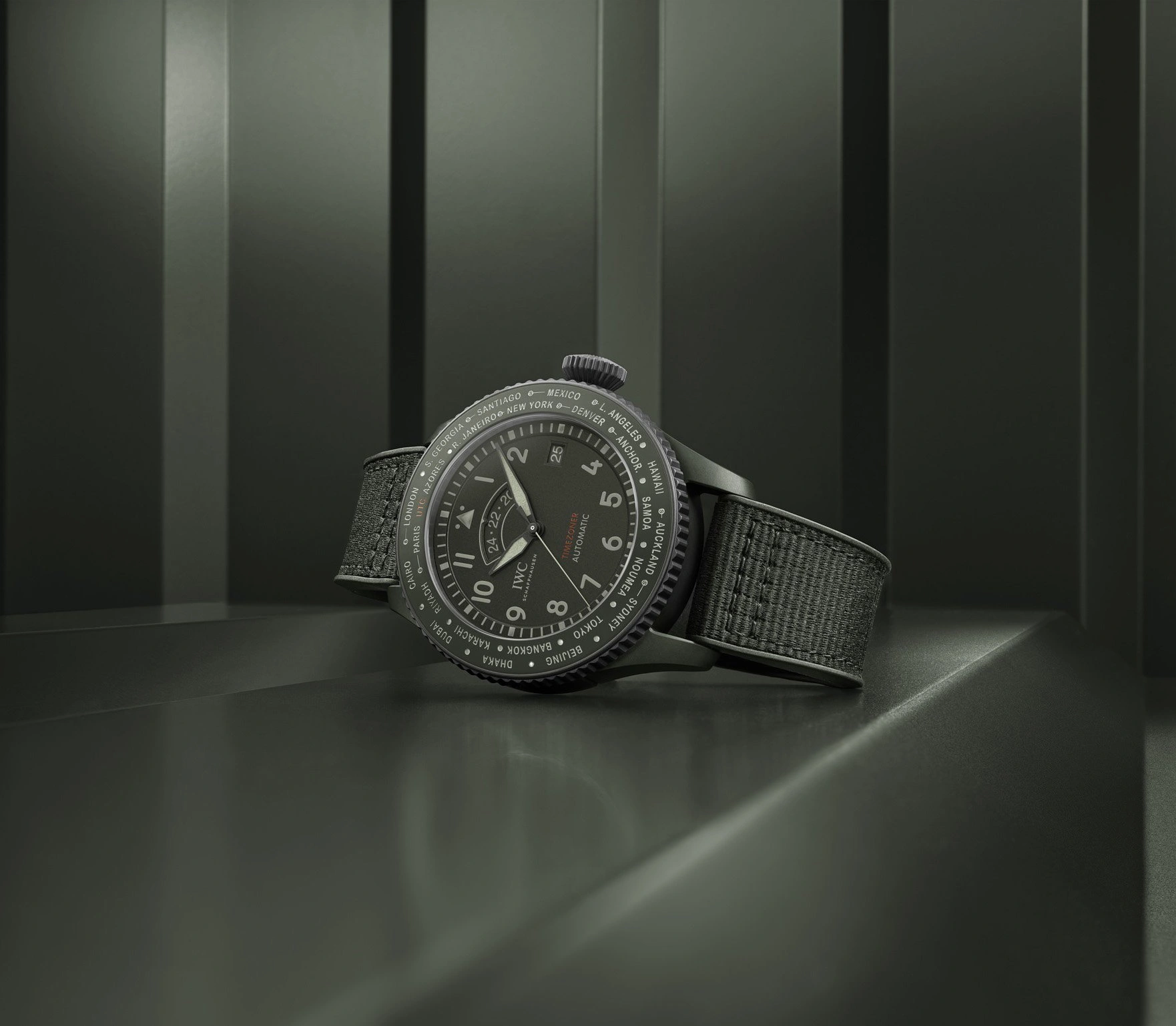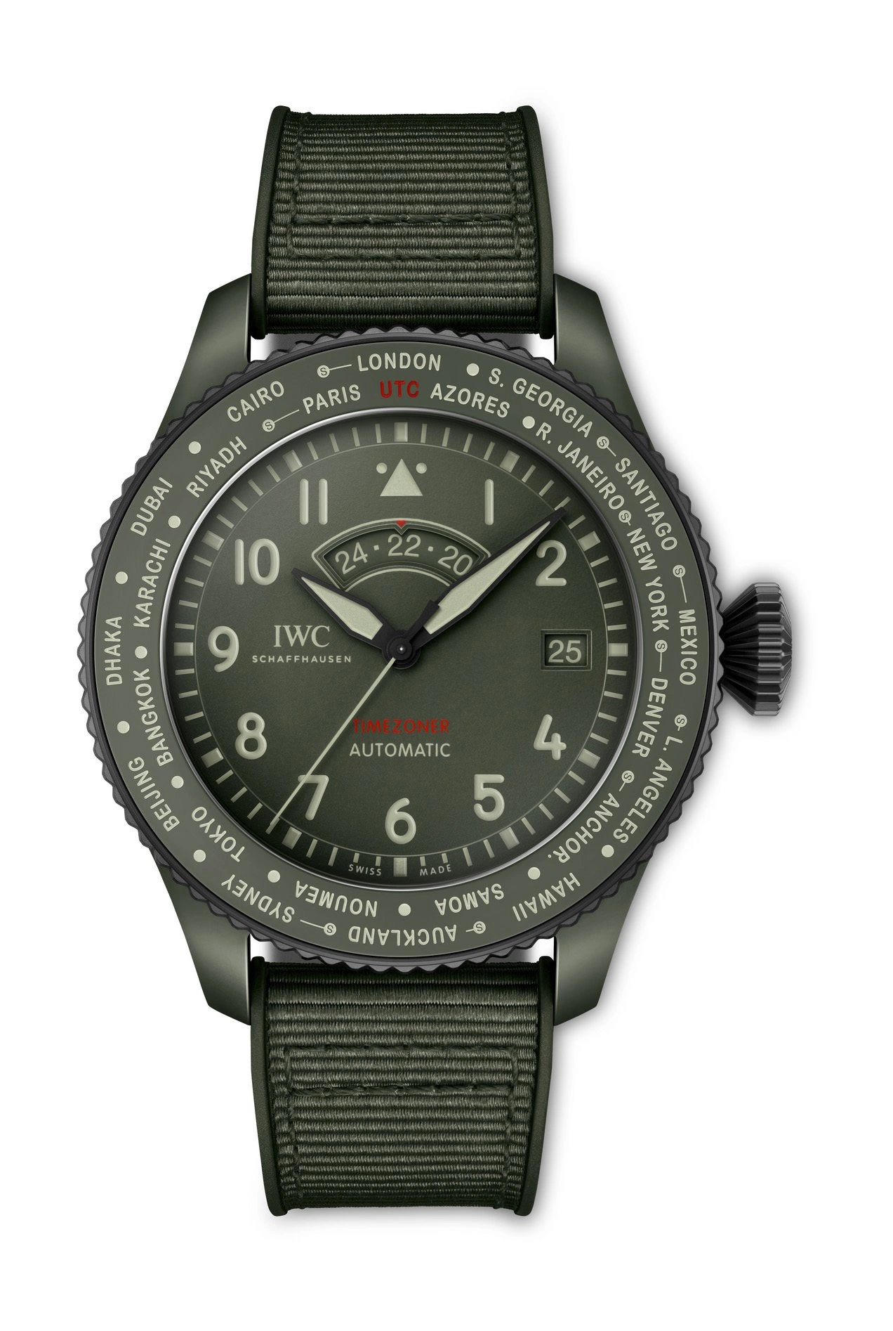 The IWC Pilot's Watch Timezoner Top Gun Ceratanium reference IW395601 was introduced in 2021. This watch has a green ceramic case of 46.00mm, which holds the self-winding caliber 82760 'Timezoner' movement.