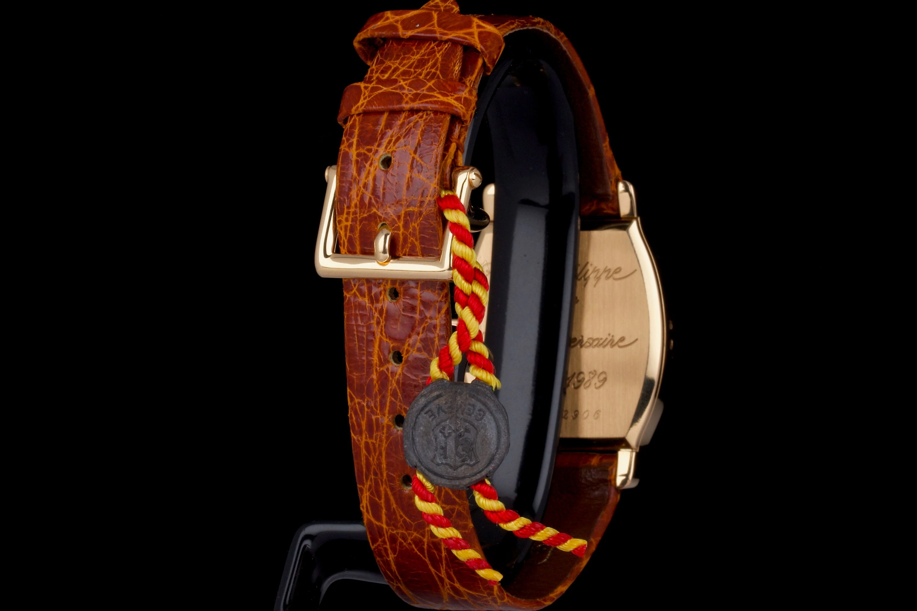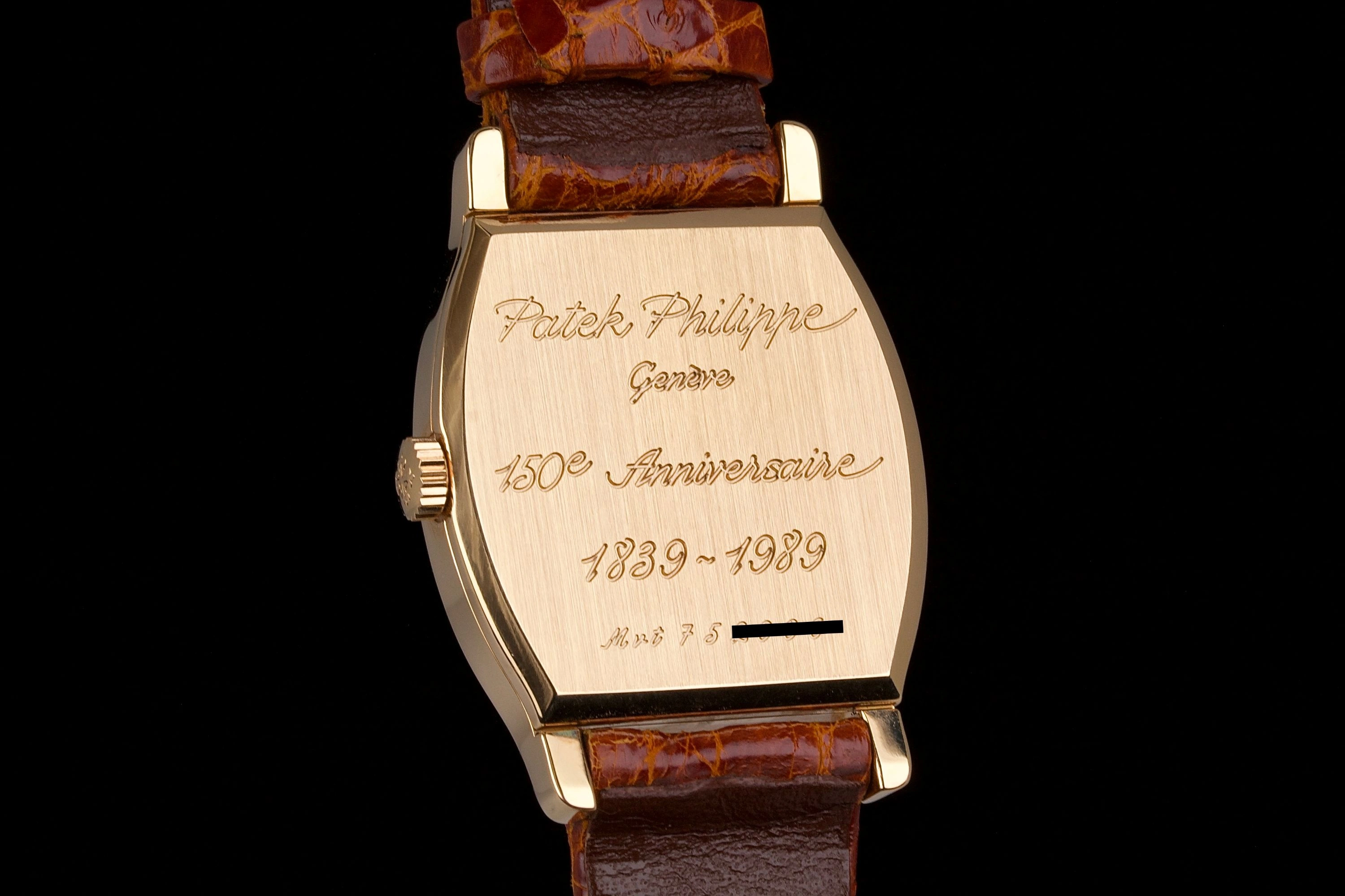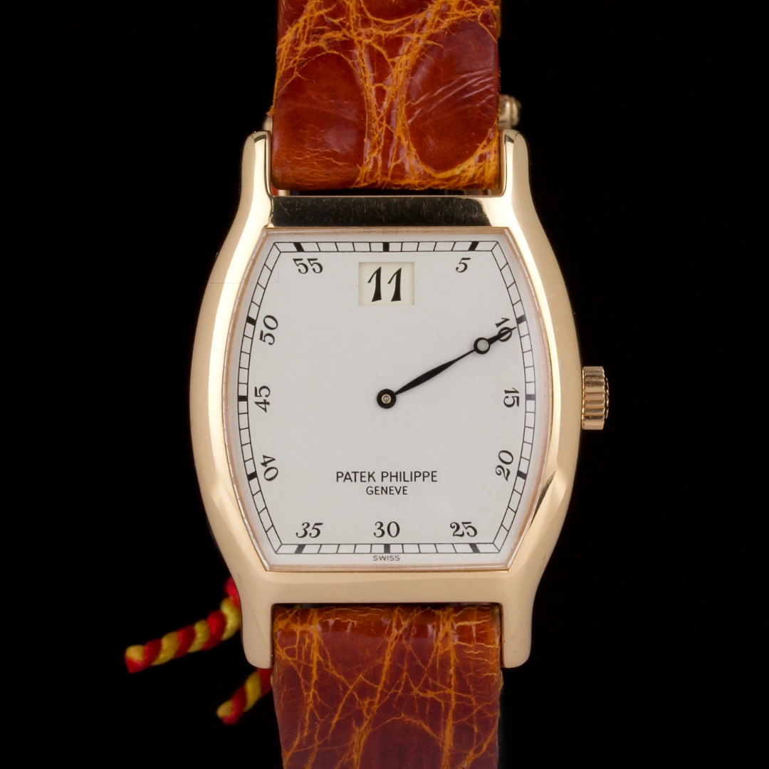 The ref. 3969R with a 29 x 38mm case was made especially to celebrate Patek Philippe’s 150th anniversary. With only 450 examples being produced in 18K pink gold, and 50 in platinum, the ref. 3969 offers collectors access to a rare style in the Patek Philippe catalog of timepieces. The aperture at 12 o’clock reveals the hour digitally and ‘jump’ from hour to hour as the minute hand travels around the dial. The movement is a manual wind caliber 215 HG (HG denoting the jump hour complication). The clean white enamel dial enhances the purity of this Art Deco-inspired design.