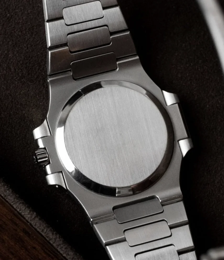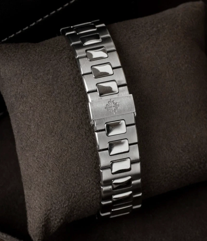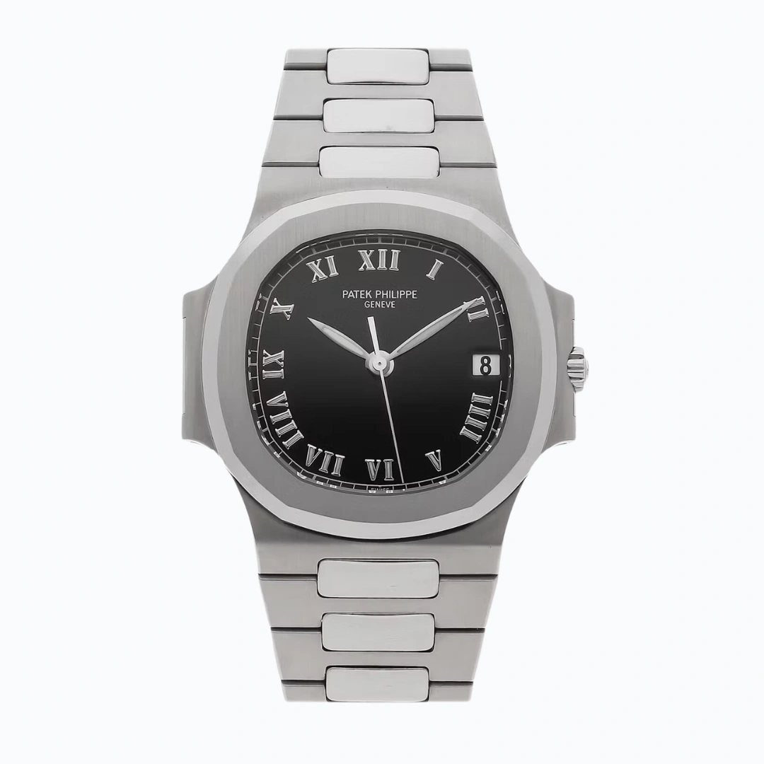 Patek Philippe Nautilus (38001A001) self - winding automatic watch, features a 37.5mm stainless steel case surrounding a black dial on a stainless steel bracelet with folding buckle. Functions include hours, minutes, seconds and date.