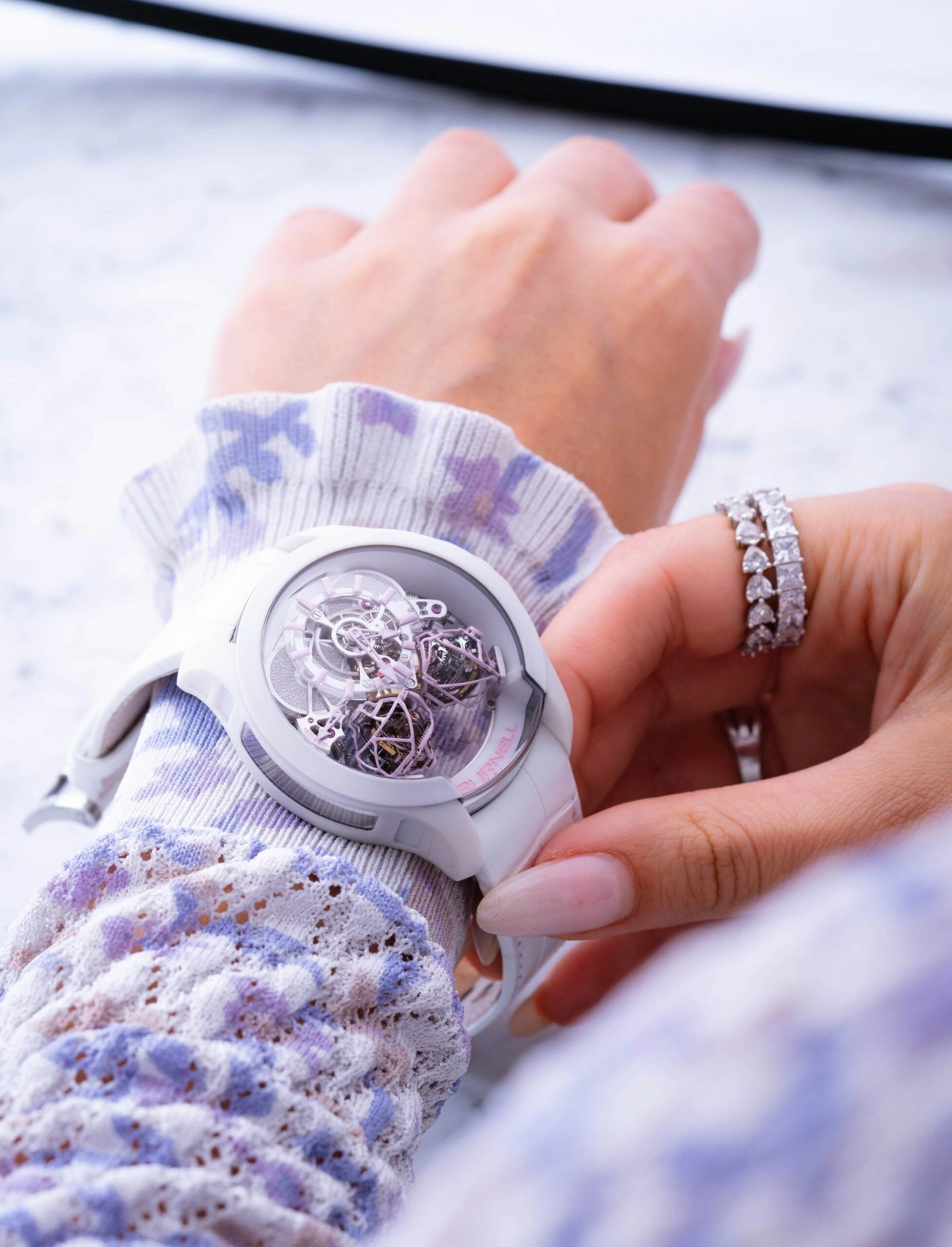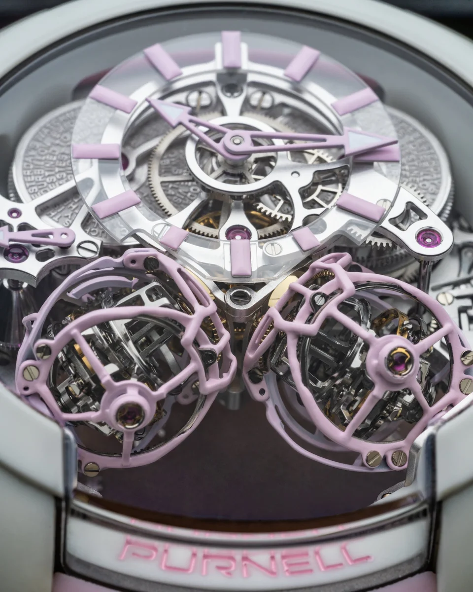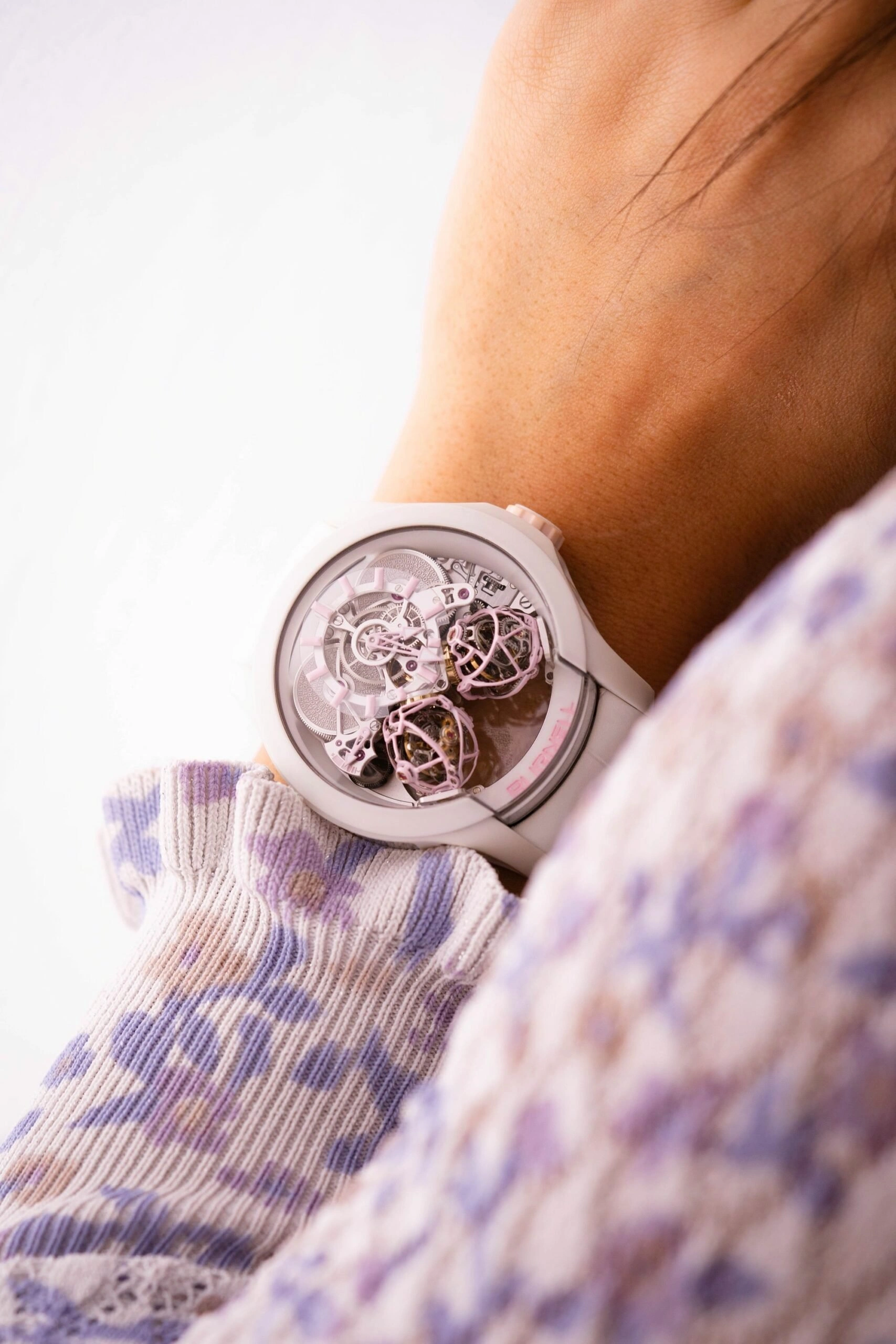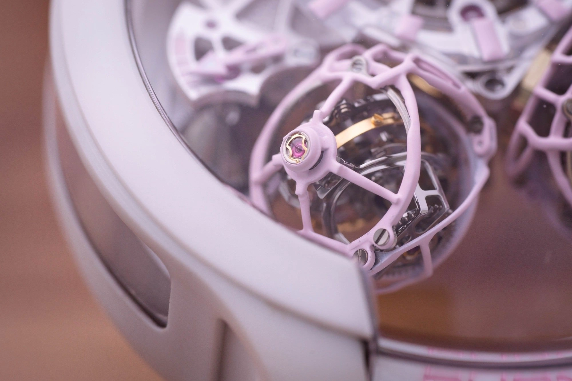 The world’s fastest triple axis tourbillon. P03 caliber with a double Spherion developed with watchmaker Eric Coudray. Case material in White Purnell Microfiber.