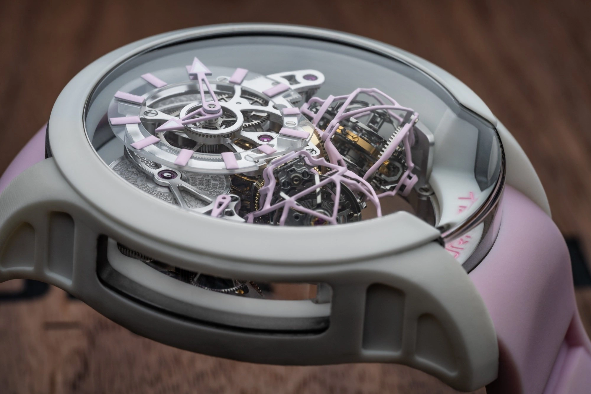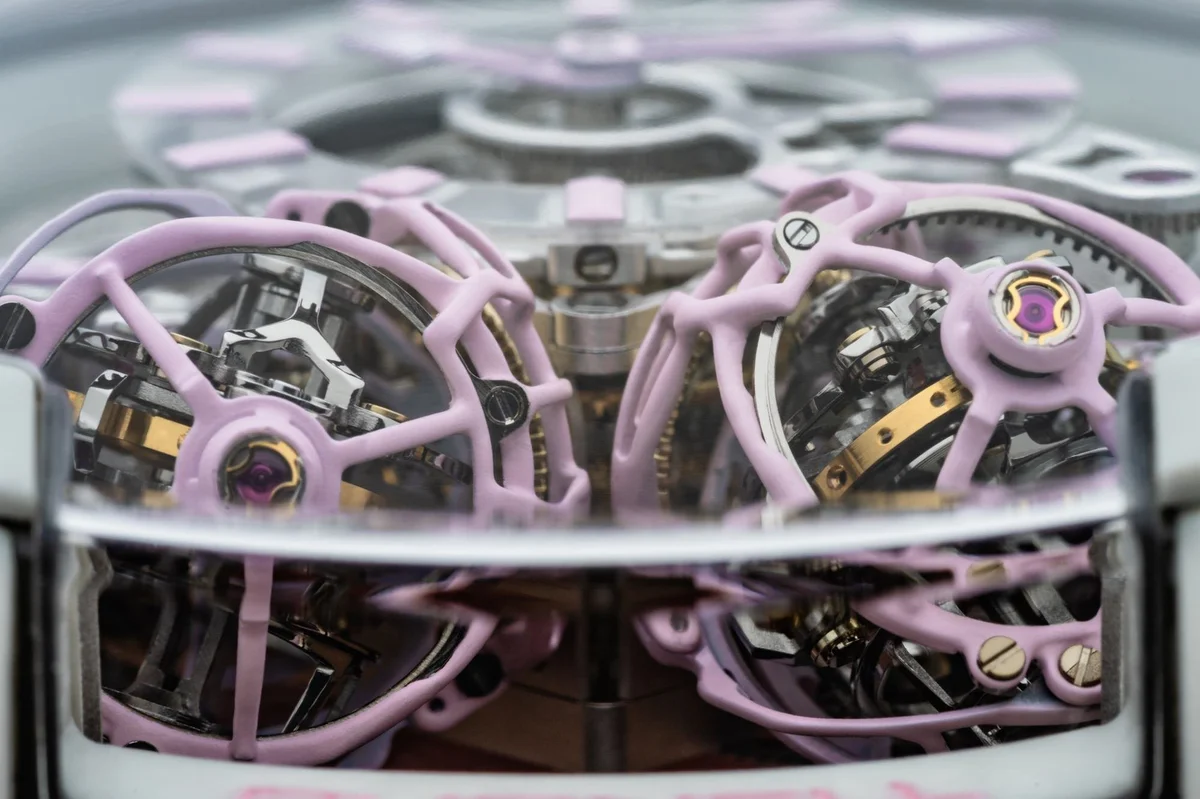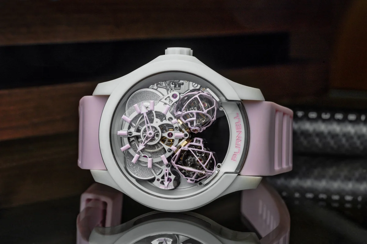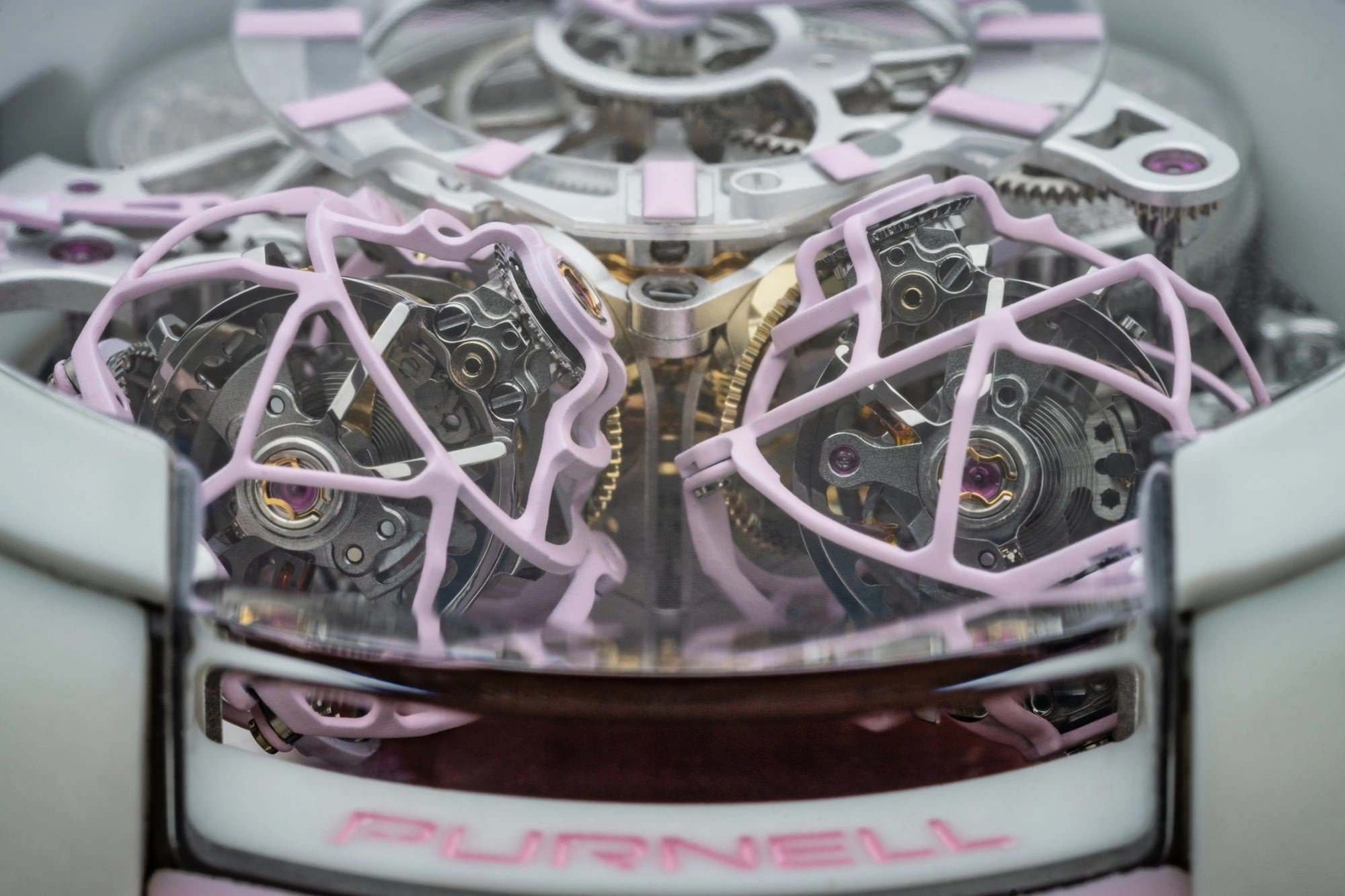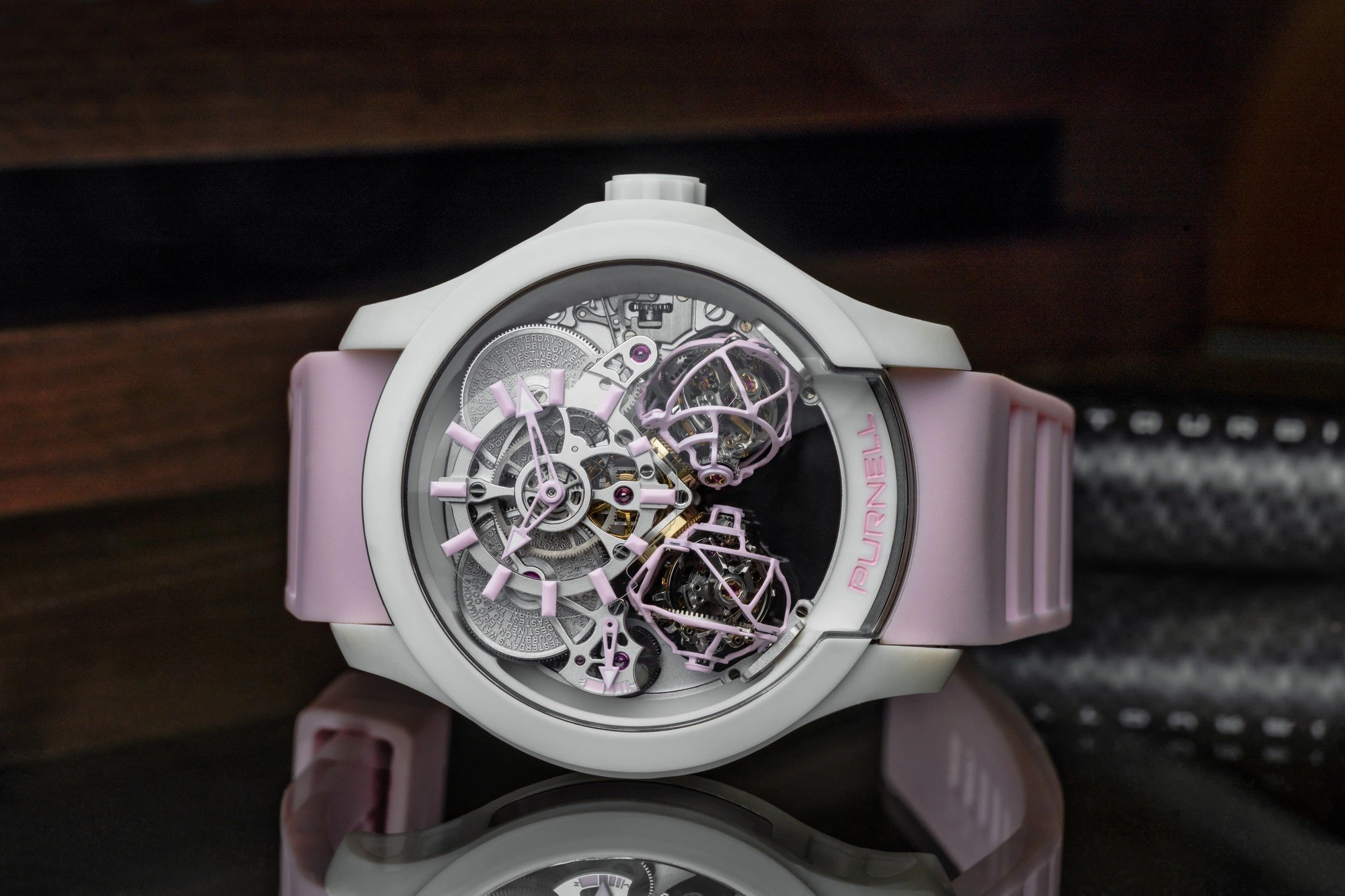 The world’s fastest triple axis tourbillon. P03 caliber with a double Spherion developed with watchmaker Eric Coudray. Case material in White Purnell Microfiber.