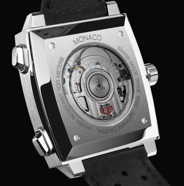 This automatic chronograph Monaco Calibre 11 is THE original model, the very first square and waterproof chronograph in the world. Revolutionary and icon of the "King of cool" Steve McQueen, this calibre 11 edition still features the famous crown on the left; it was a way of showing that manual winding was no longer necessary. The groundbreaking design elements are all in place: blue dial with horizontal steel indexes, silver sub-dials for chronograph minutes and chronograph hours, date at 6 o’clock, and a red chronograph hand to give it a racing touch.