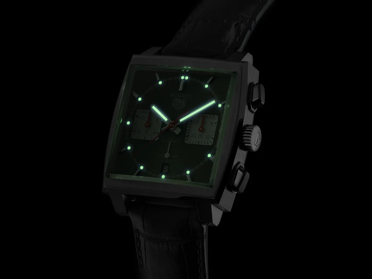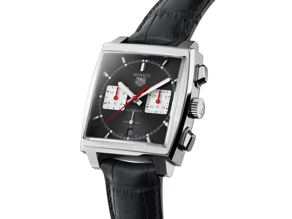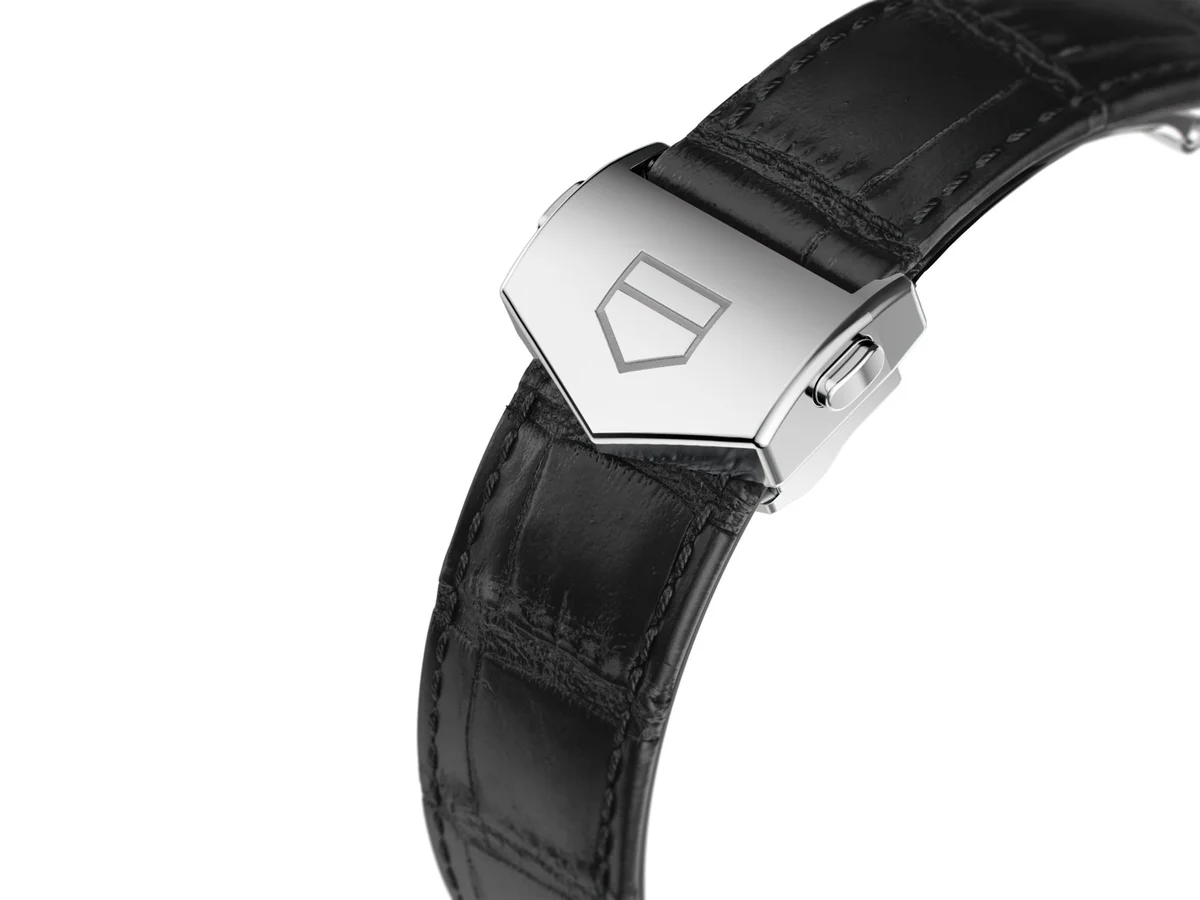 This elegant Monaco pairs its iconoclastic squared-off watch face with a stunning black dial and a black alligator strap. A maverick piece with our in-house automatic Heuer 02 movement, whose power reserve exceeds 80 hours.