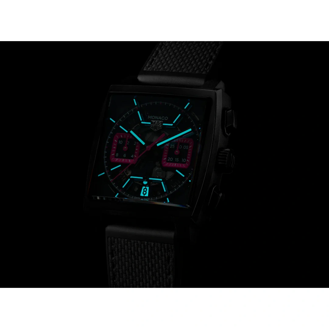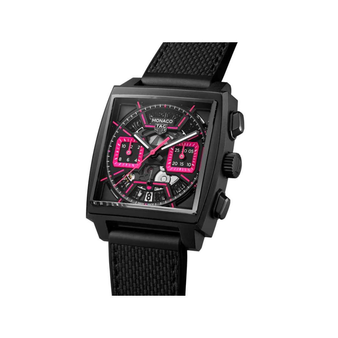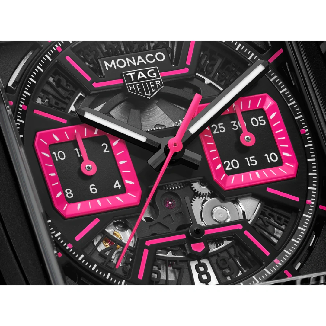 Step into a world of bold innovation with this avant-garde TAG Heuer Monaco. A contemporary twist on a classic, this timepiece melds vibrant pink with sleek black in a striking skeleton design, embodying the daring spirit of today's trailblazers.