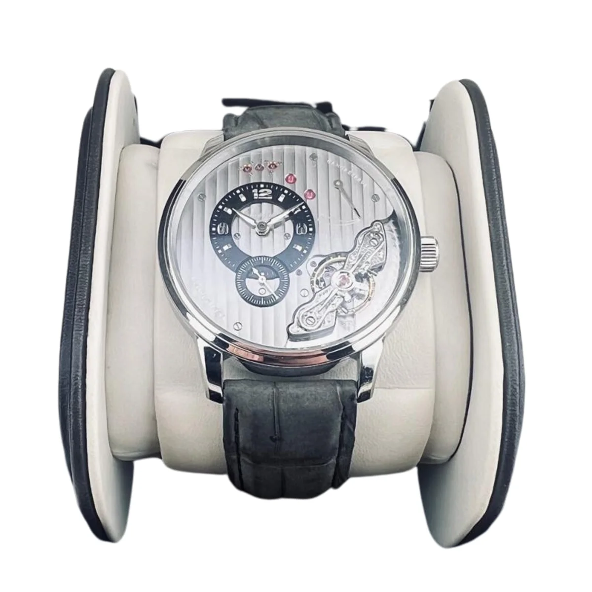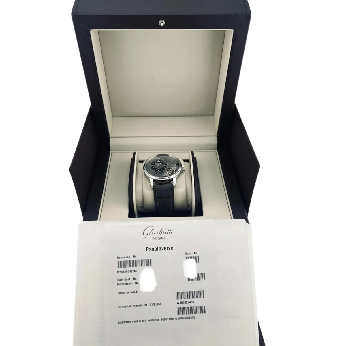 The Glashuette Original PanoInverse 1-66-06-04-22-62 has a Stainless Steel case of 42.00mm. The inverse arrangement of the movement a is on display through both the front as well as through the see-through case back.