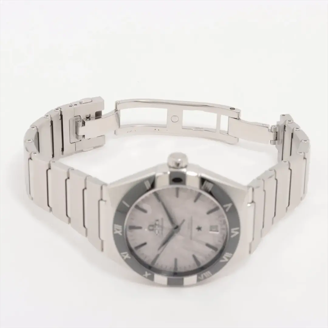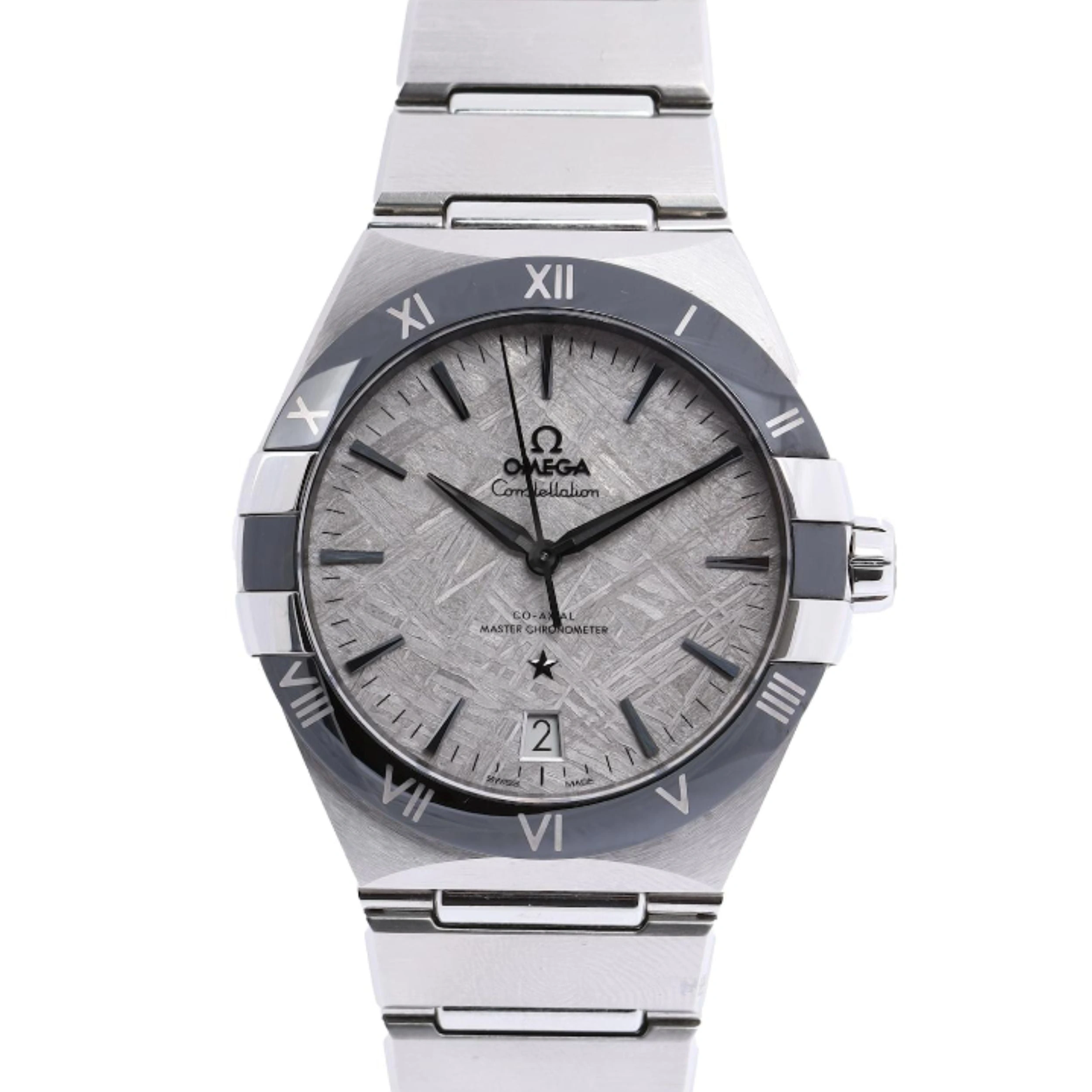 The Omega Constellation reference 131.30.41.21.99.001, introduced in 2024, has a stainless steel case of 41.00mm, which is crowned by a ceramic bezel. Inside ticks the self-winding caliber 8900. The dial is Silver meteorite. The watch has a 41 mm case and a monobloc bracelet made of stainless steel with the characteristic features of the Constellation, including the polished claws, half-moon facets and the Roman numerals made of Liquidmetal™ on the black ceramic bezel. The fascinating dial is made of genuine iron meteorite, which has been electroplated in rhodium grey.