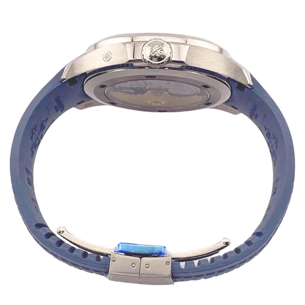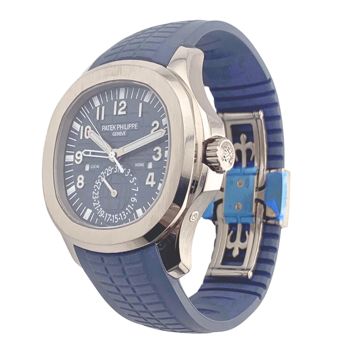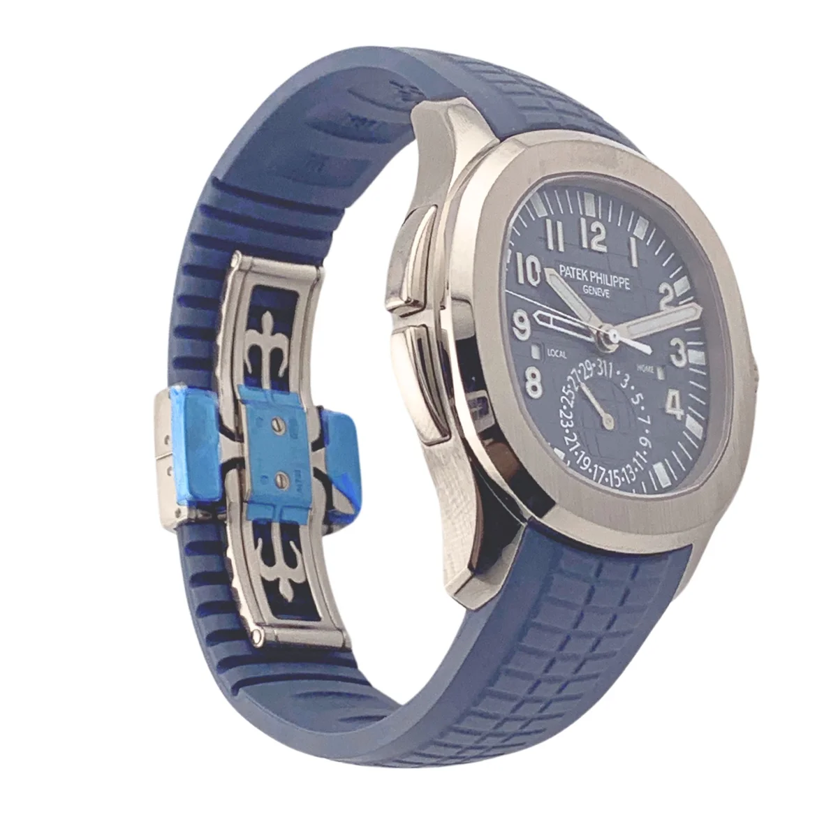A contemporary, elegant and casual travel watch, the Aquanaut Travel Time Reference 5164 is offered in its first white gold version. The opaline blue-gray dial is adorned with the emblematic Aquanaut pattern, while the integrated composite strap matching the dial color features a patented white gold fold-over clasp. The case houses self-winding 26-330 S C FUS caliber with Travel Time display, combining excellent legibility with user-friendliness. The date is indexed to local time.