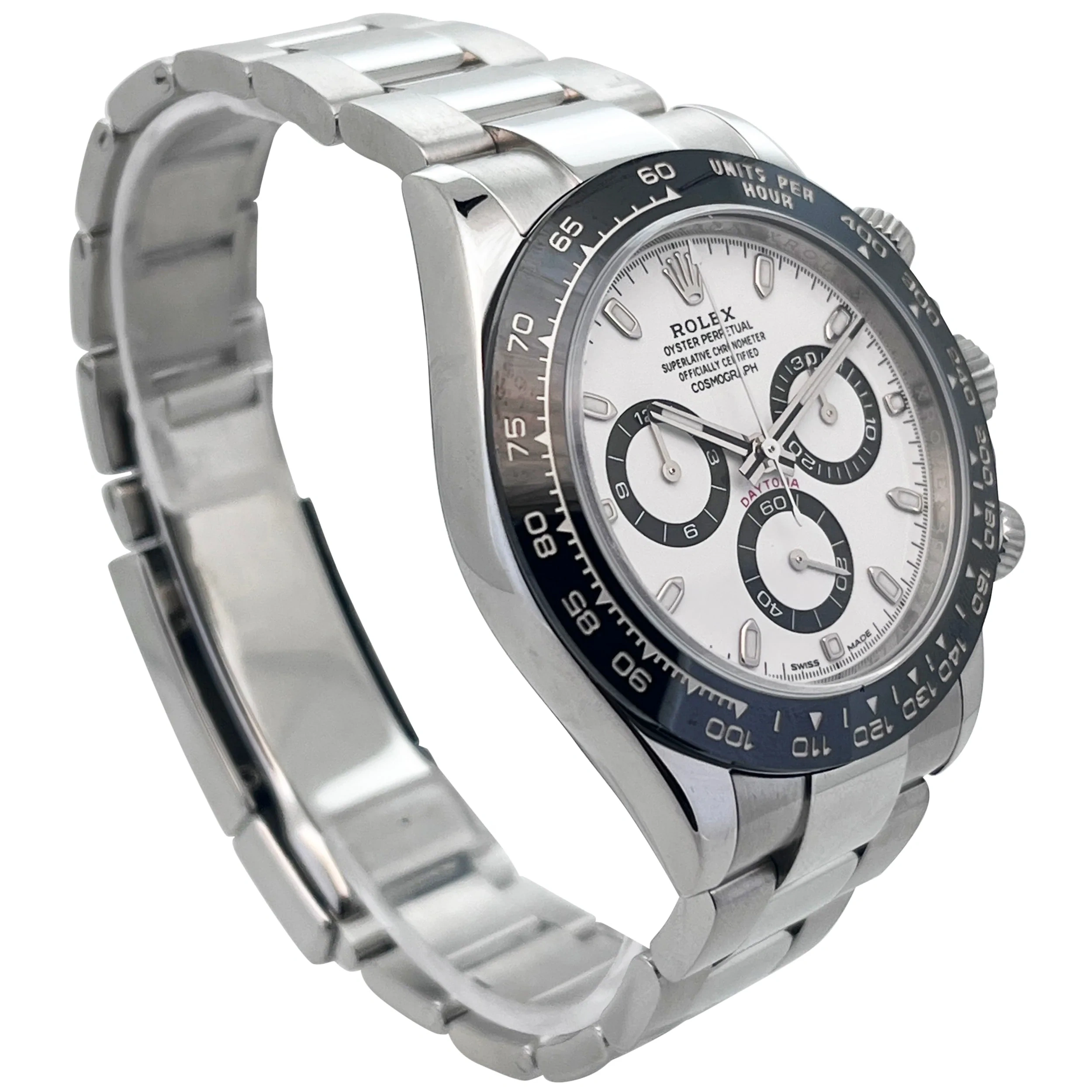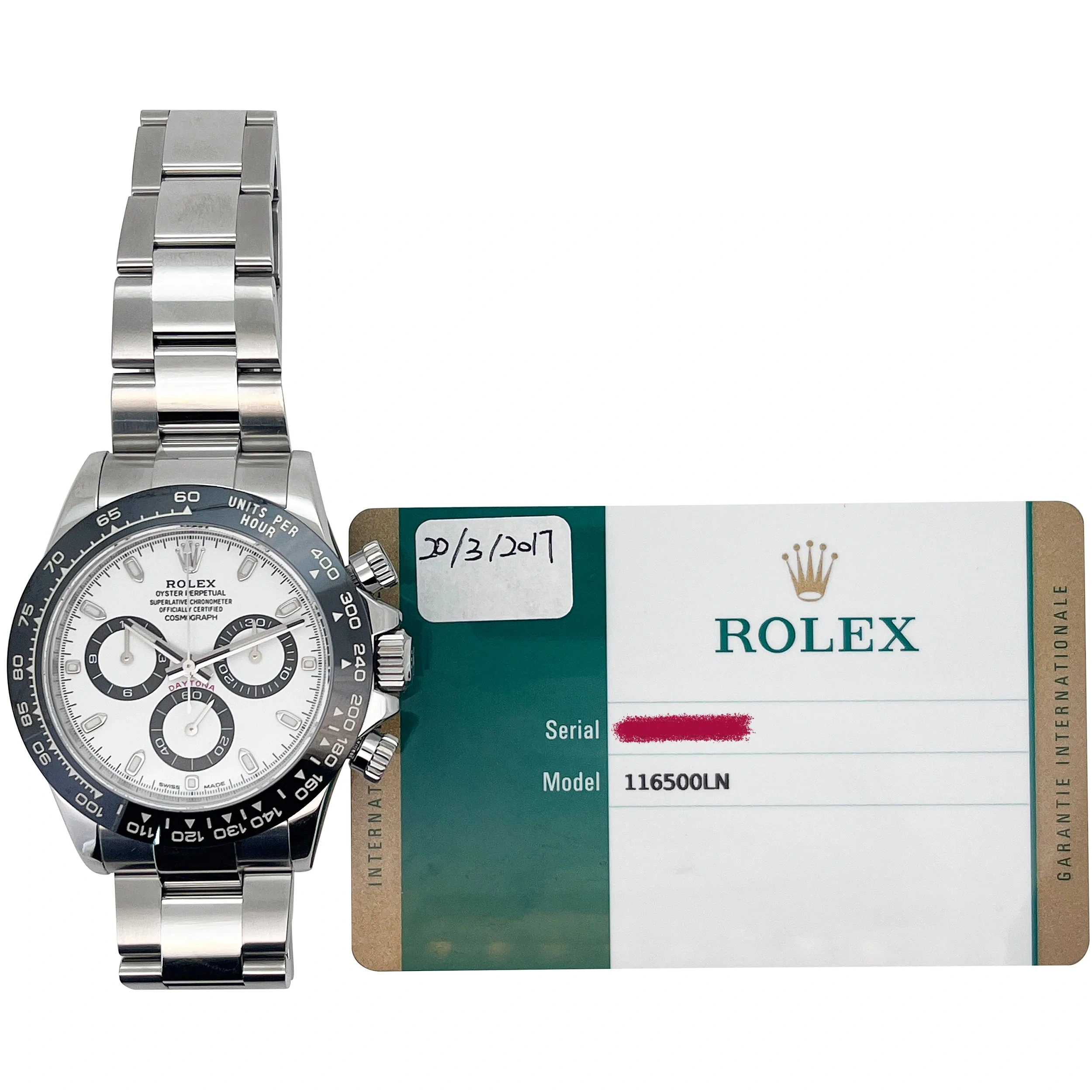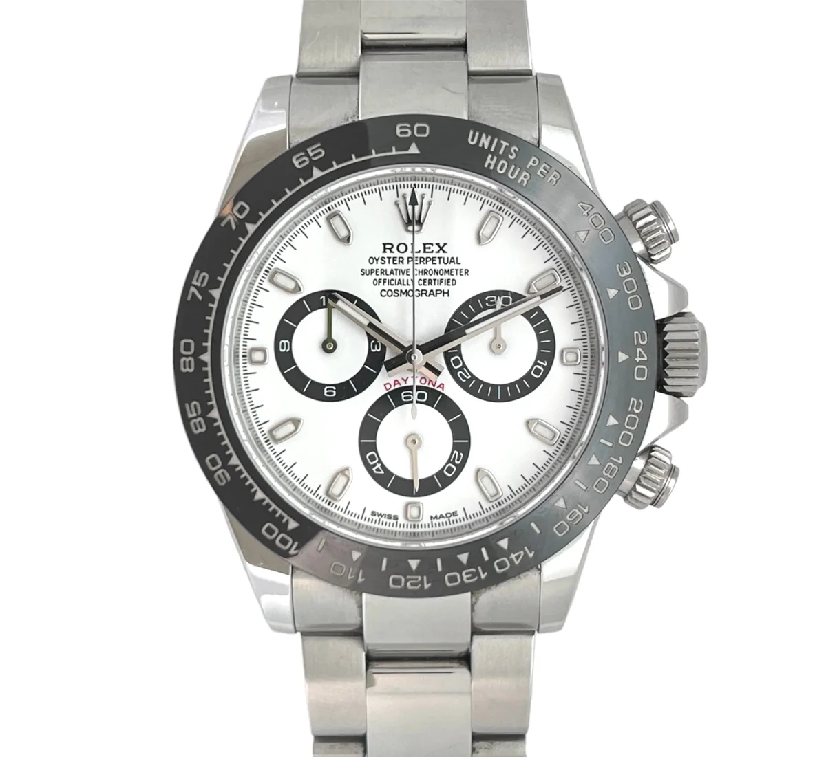 Introduced at BaselWorld 2016, the Rolex Daytona 116500ln-0001 features a stainless steel case and a black ceramic bezel and a white dial also called teh Panda Daytona. The Oyster Perpetual Cosmograph Daytona in Oystersteel with a white dial and an Oyster bracelet, features a black Cerachrom bezel with tachymetric scale.