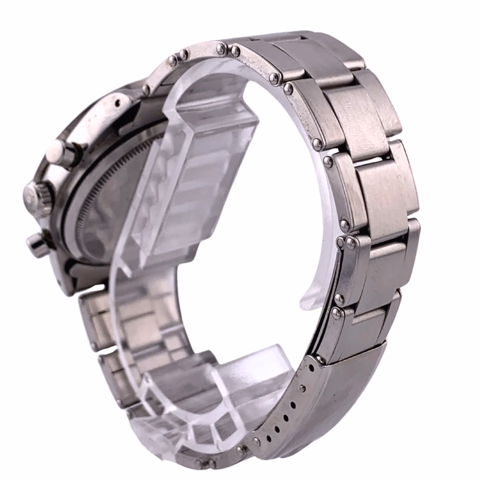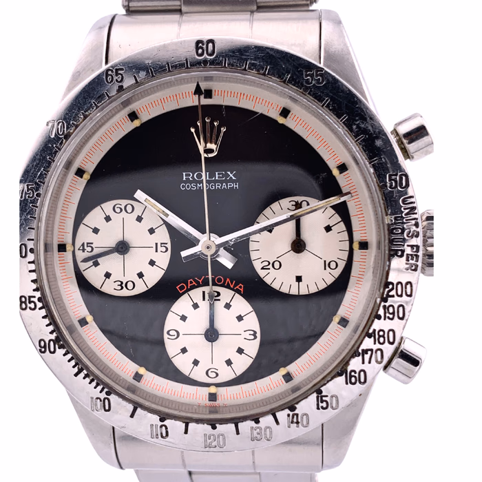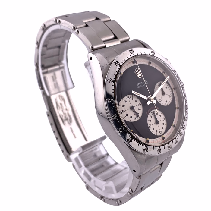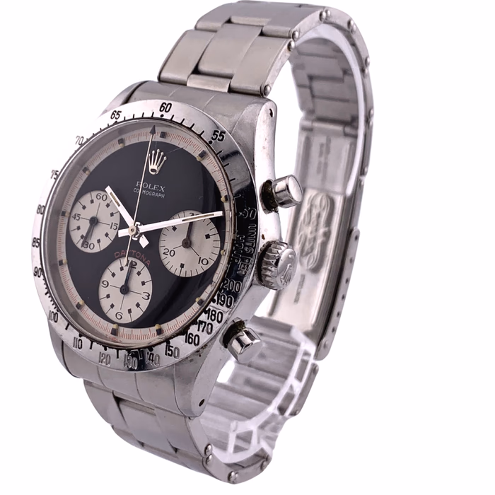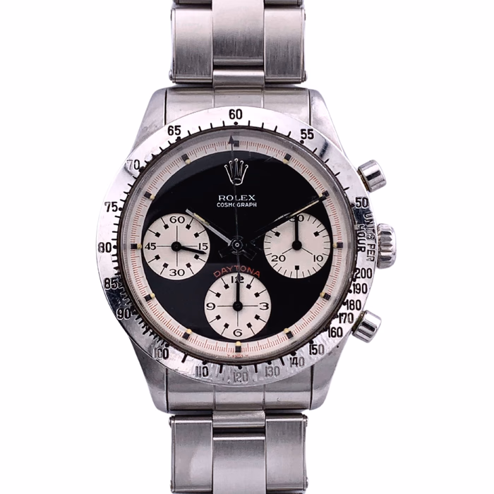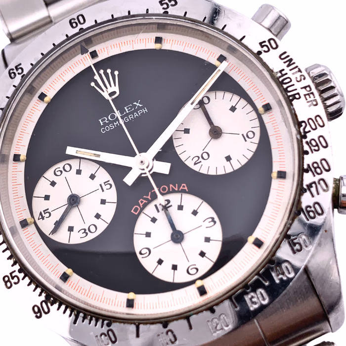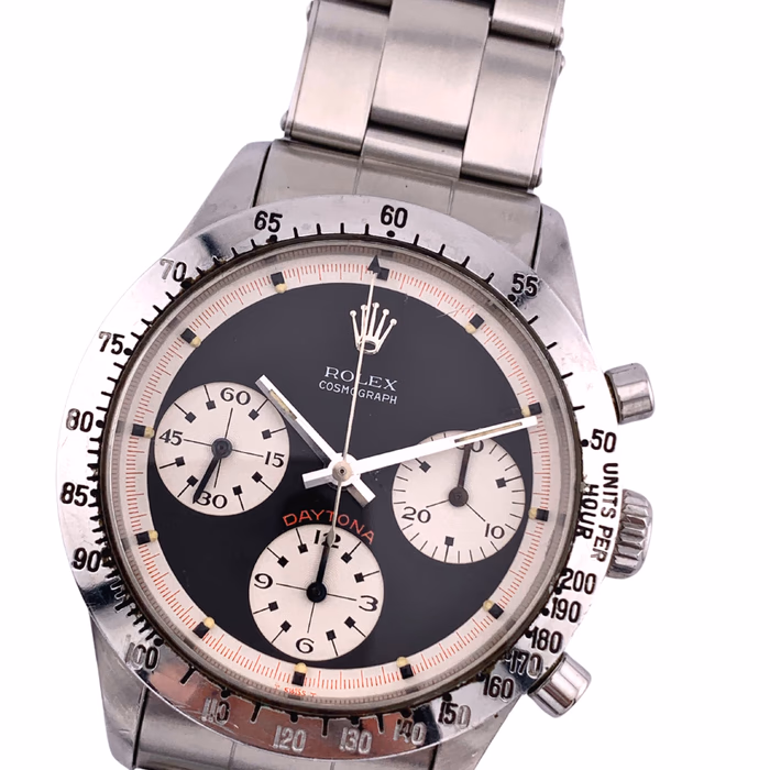 Introduced in 1963, the Rolex ref. 6239 is the first iteration of the Rolex Daytona and also the first Paul Newman Daytona. While Paul Newman’s own Rolex ref. 6239 sported a “Tri-color” white dial with contrasting black chronograph registers and red accents, the model was also produced with a black exotic dial with white registers and a red minute track surrounding the dial’s perimeter. Furthermore, the red color was also used for the DAYTONA logo above 6 o’clock on both dial variants, while the stationary metal bezel is engraved with the tachymeter scale. The case has pump pushers at 2 and 4 o’clock rather than screw-down pushers. It is estimated that Rolex only produced about 2,000 to 3,000 Paul Newman dials.