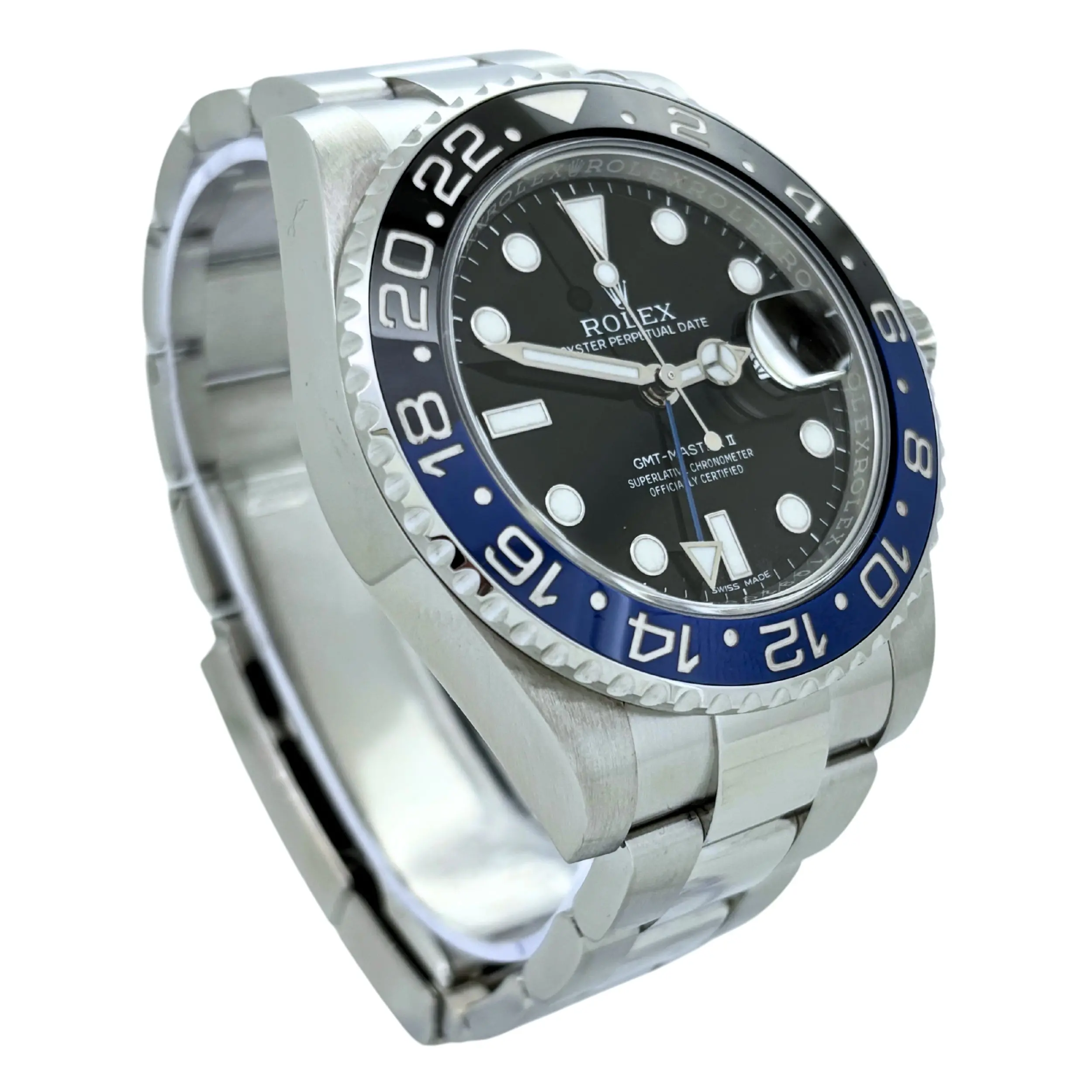 Introduced in 2013, the GMT-Master II BLNR uses a distinct Black/ Blue (or 'Day & Night') bezel in ceramic. It is powered by caliber 3186.