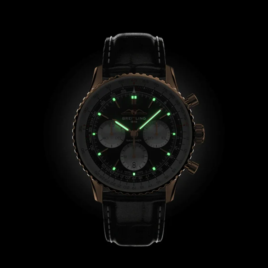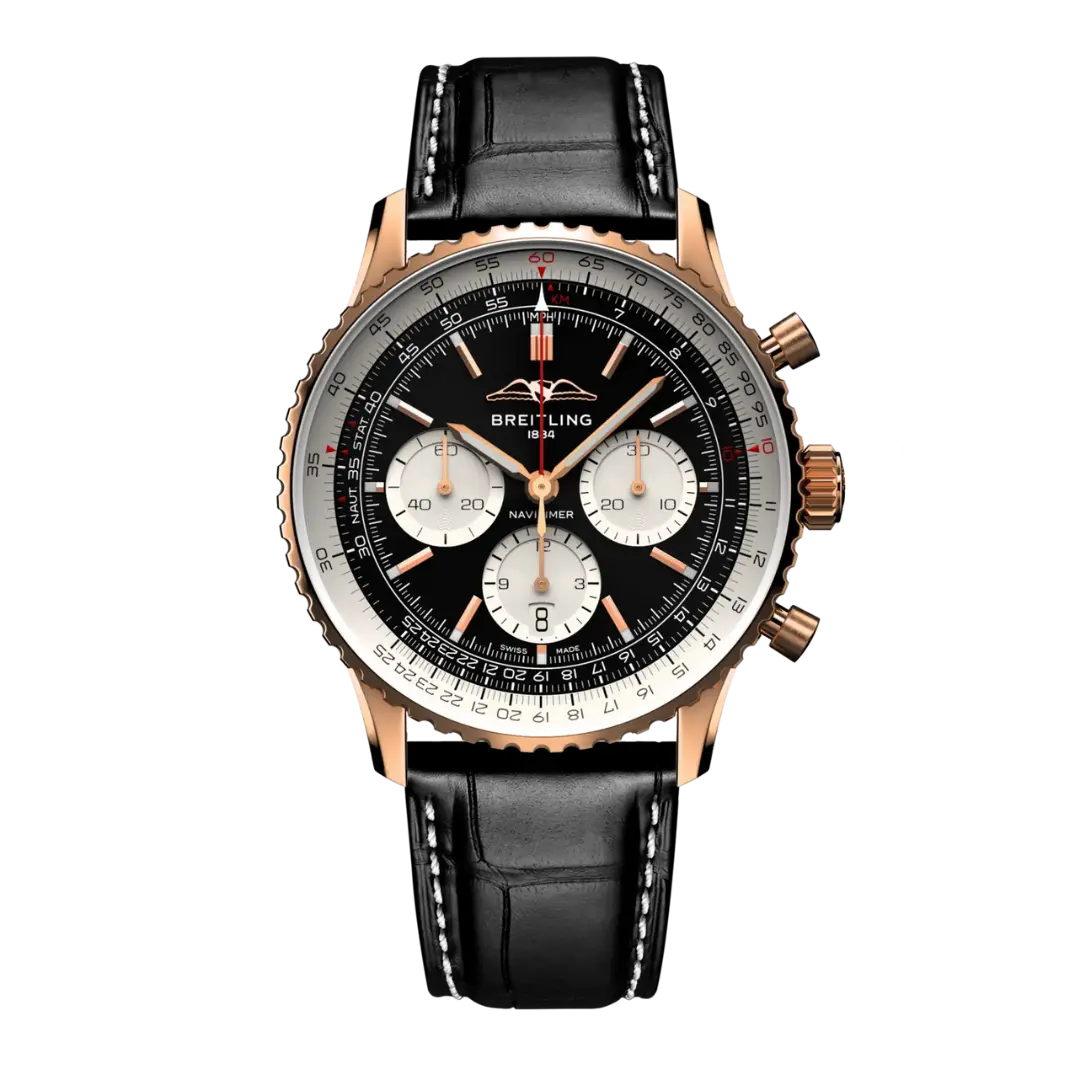 The Breitling Navitimer reference RB0138211B1P1 is part of Breitling's 2022 refresh of the iconic slide rule chronograph. This version has a Red Gold case of 43.00mm, which houses the brand's in-house caliber B01. The dial, with AOPA-inspired wing logo, is Black. Worn by astronauts in space and the biggest stars on earth, it is Breitling’s most iconic timepiece and one of the most recognizable watches of all time.