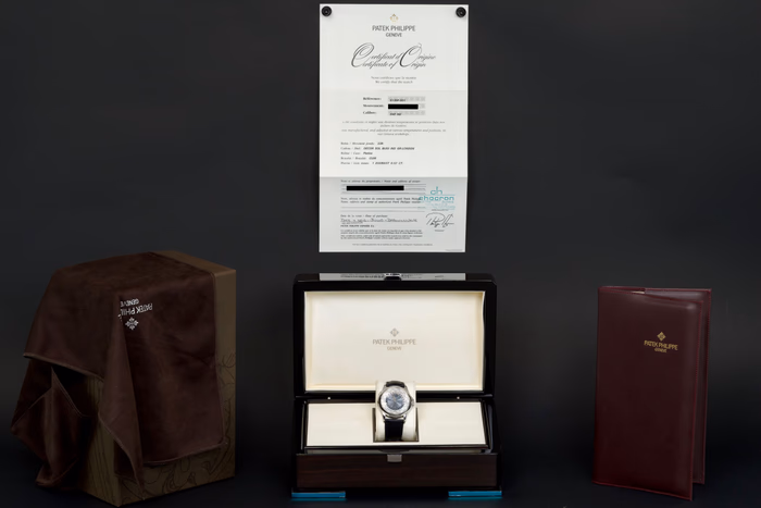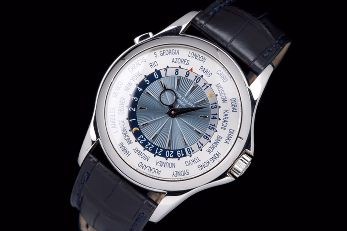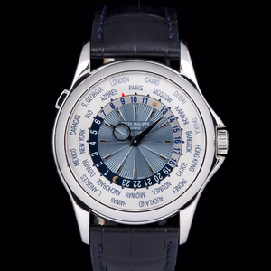 A refined example of the Patek Philippe World Time reference 5130P-001, crafted in platinum and featuring the distinctive blue-grey guilloché dial.