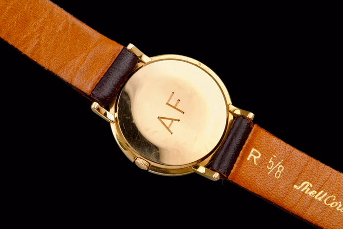 The caseback has been polished in the past and bears an engraved monogram “AF”. It is accompanied by its Extract from the Archives, confirming production in 1947 and sale in June 1958.