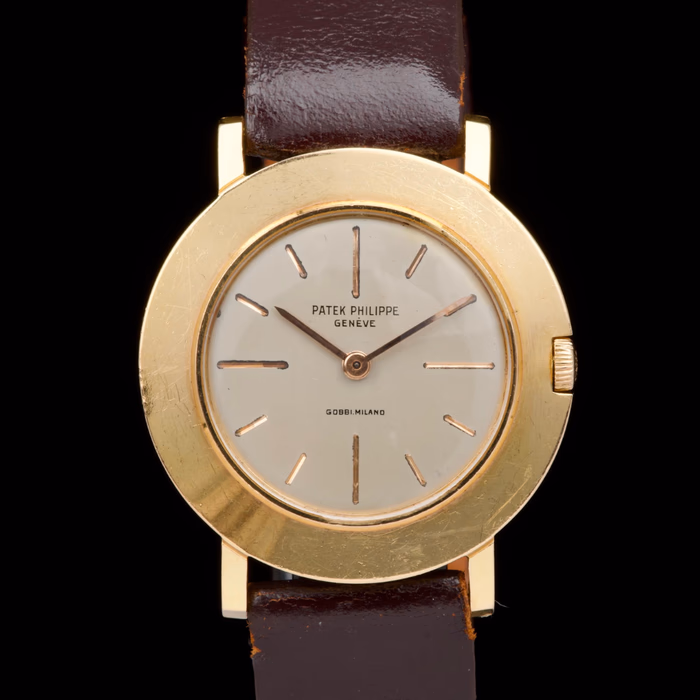 An evocative and highly charismatic example of the celebrated “Disco Volante” reference 2594, this yellow-gold Patek Philippe is distinguished by its desirable double-signed dial retailed by Gobbi Milano
