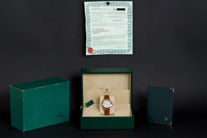 The watch comes with its original box and papers as shown. There is no service history, and it most likely has never been opened.