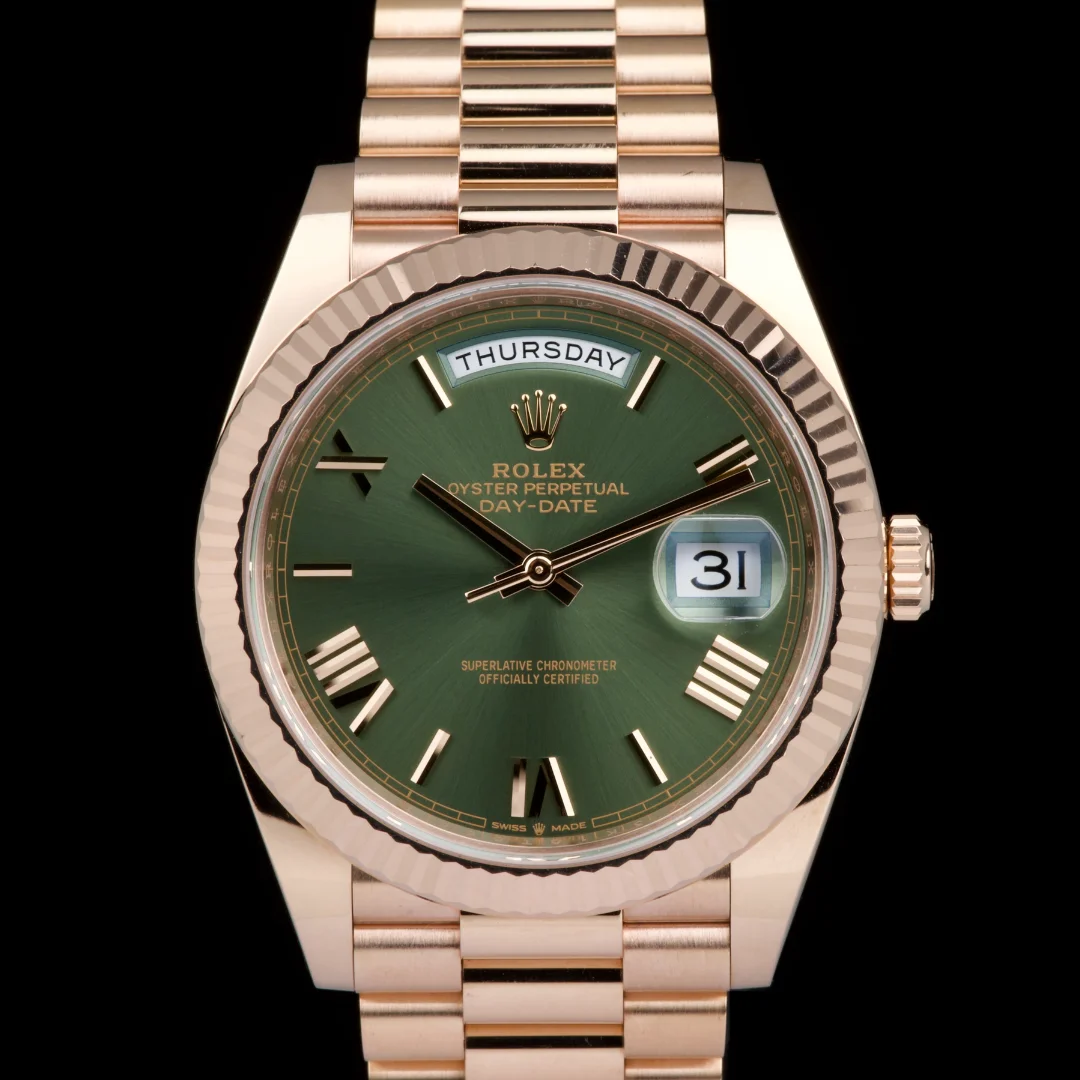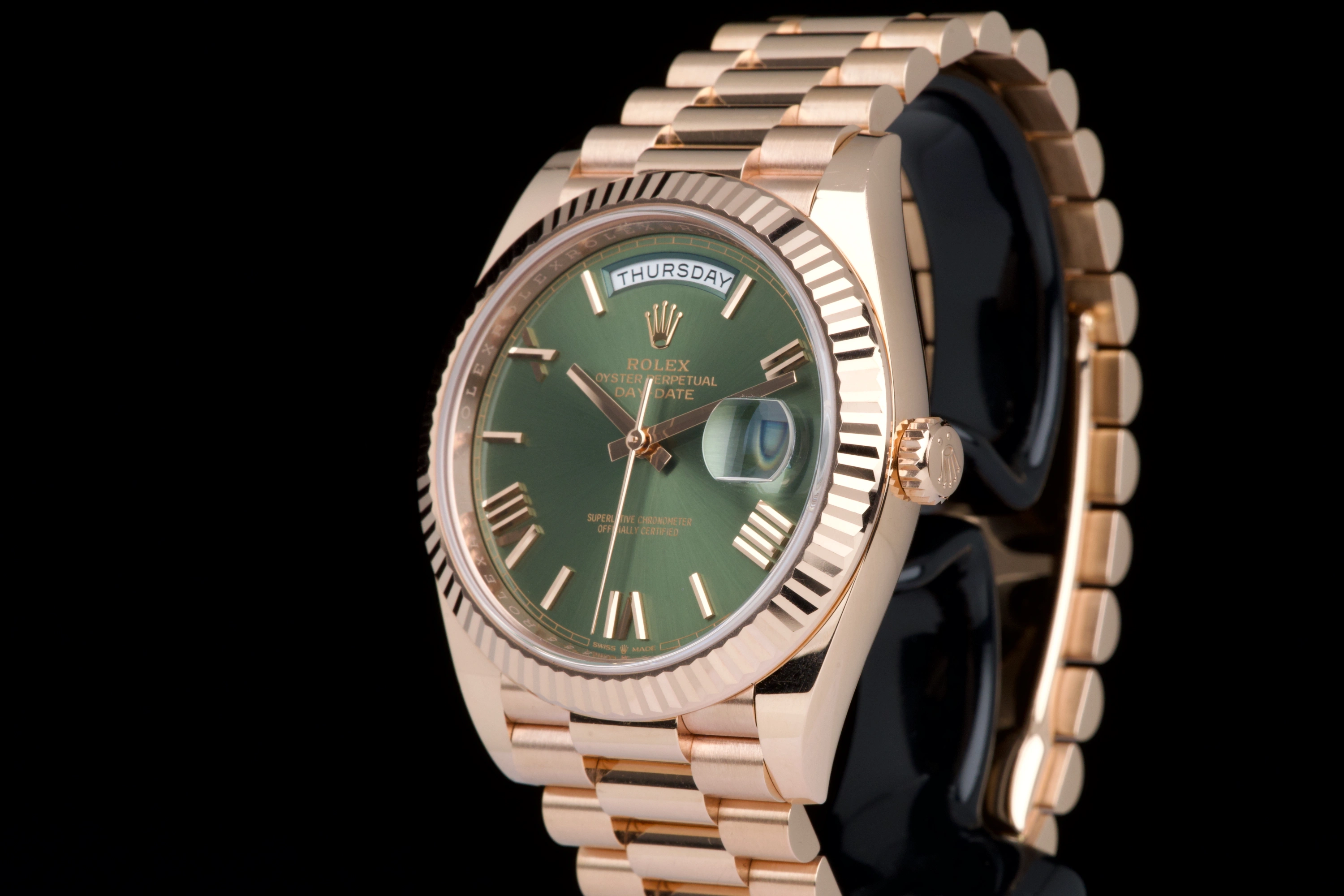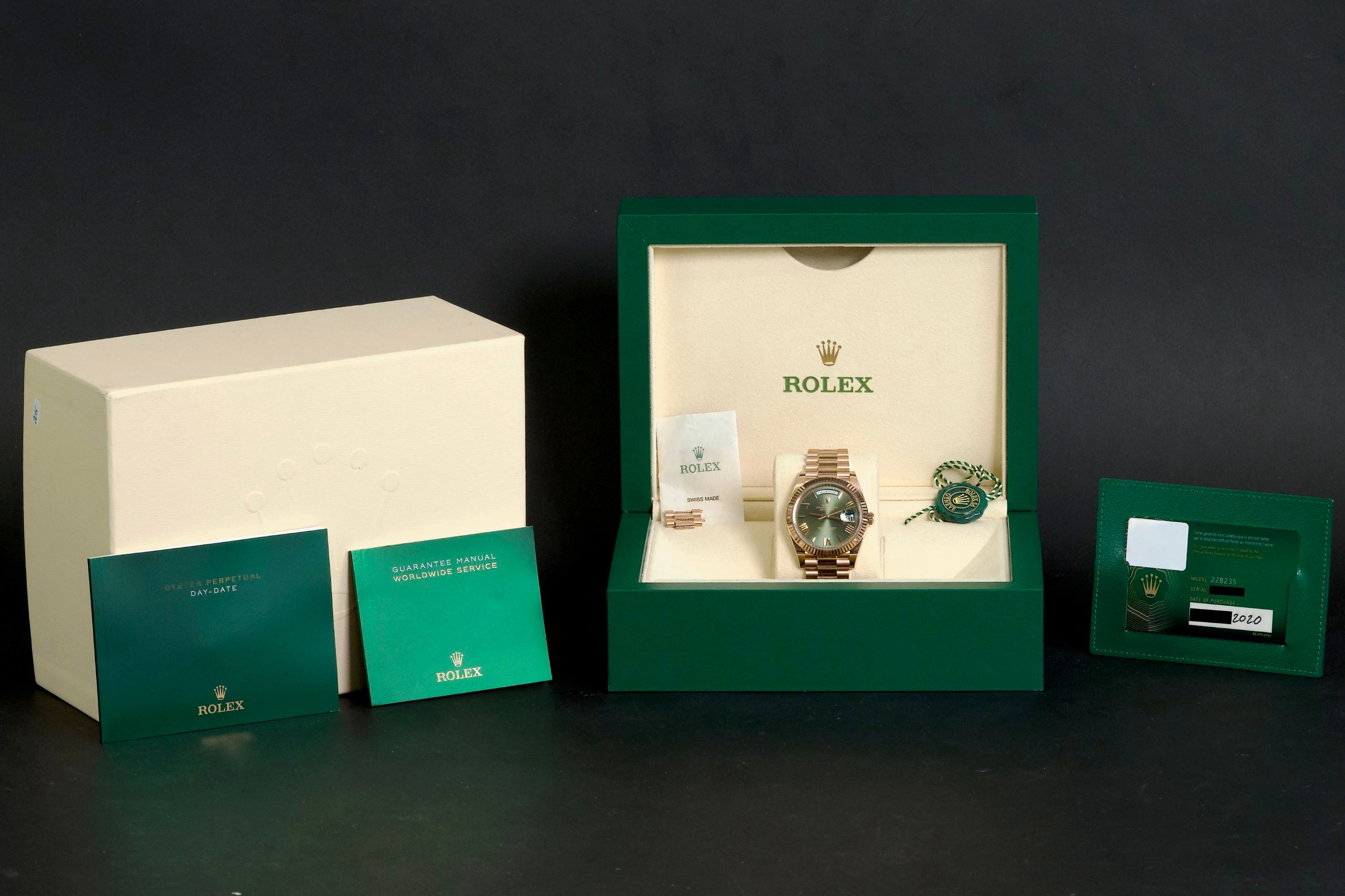 Purchased new in Switzerland in 2020. A stunning and collectible example of the Day-Date 40 in Everose gold with olive green dial