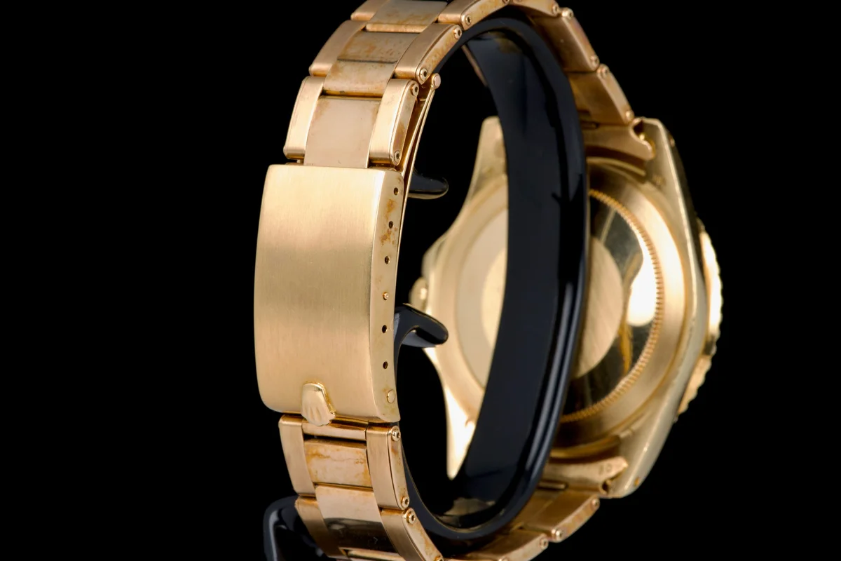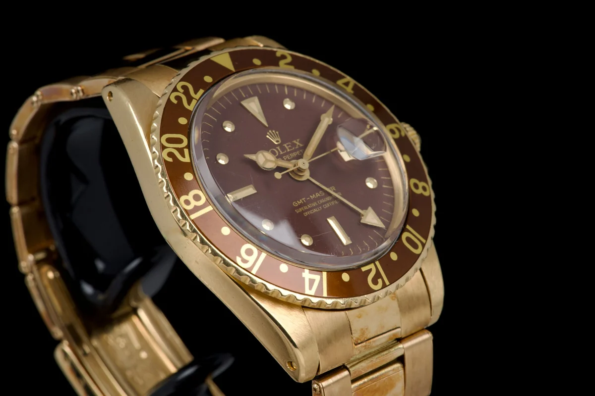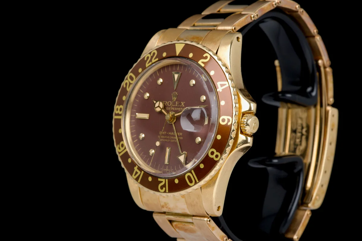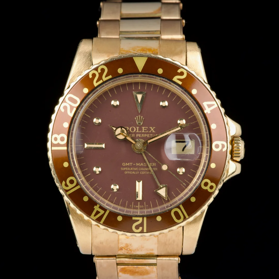 This Rolex GMT-Master 1675/8 in 18k yellow gold dates to approximately 1972 (Serial 3.59XXXX) and features the iconic “Rootbeer” aesthetic, pairing warm tones with vintage character