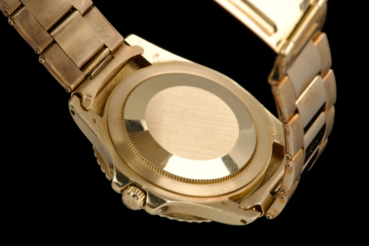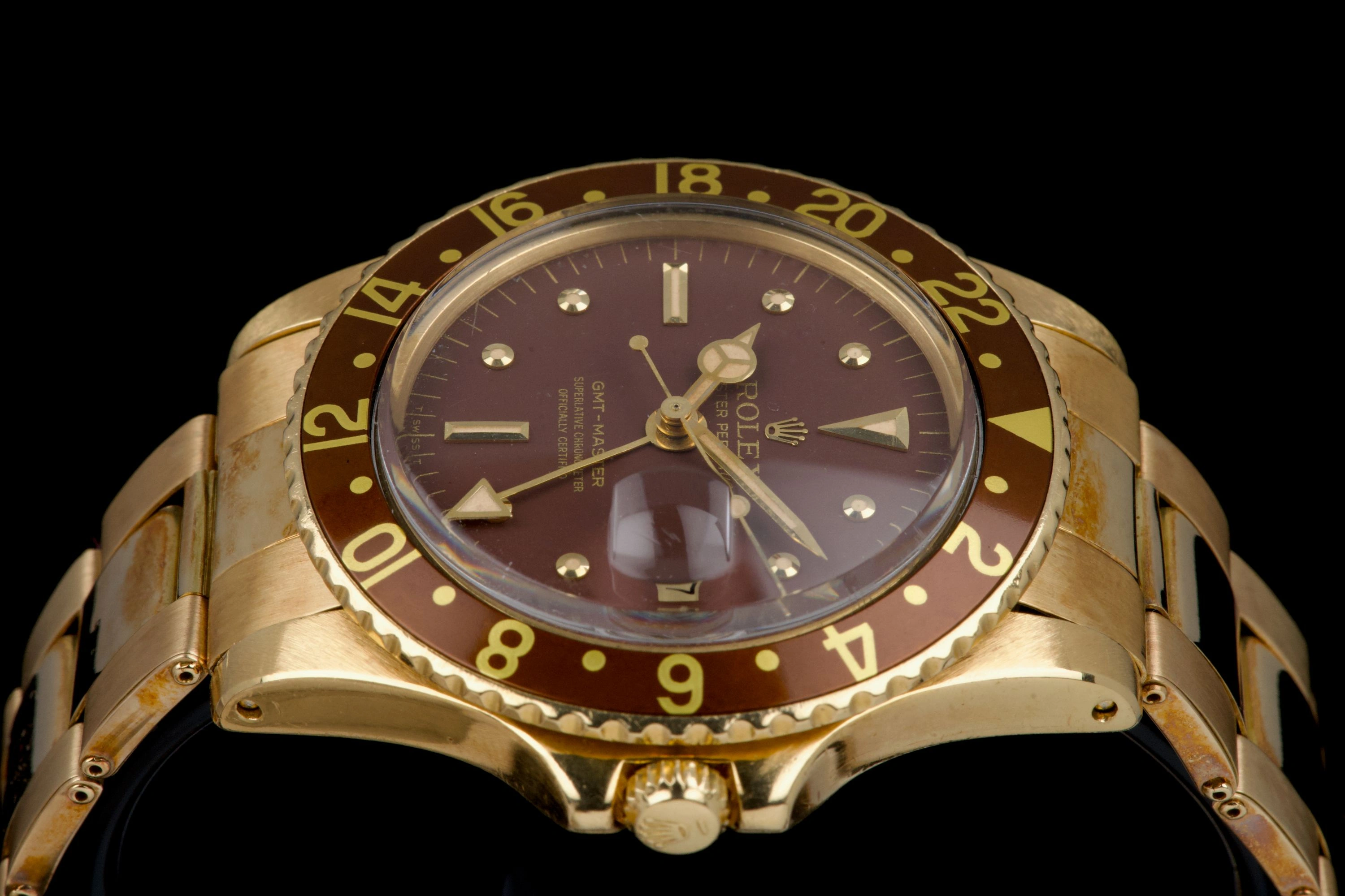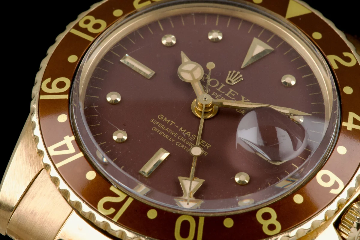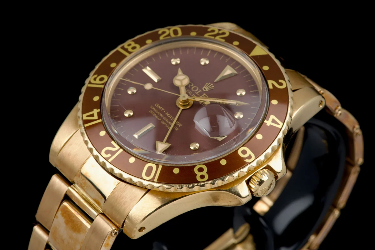 This Rolex GMT-Master 1675/8 in 18k yellow gold dates to approximately 1972 (Serial 3.59XXXX) and features the iconic “Rootbeer” aesthetic, pairing warm tones with vintage character