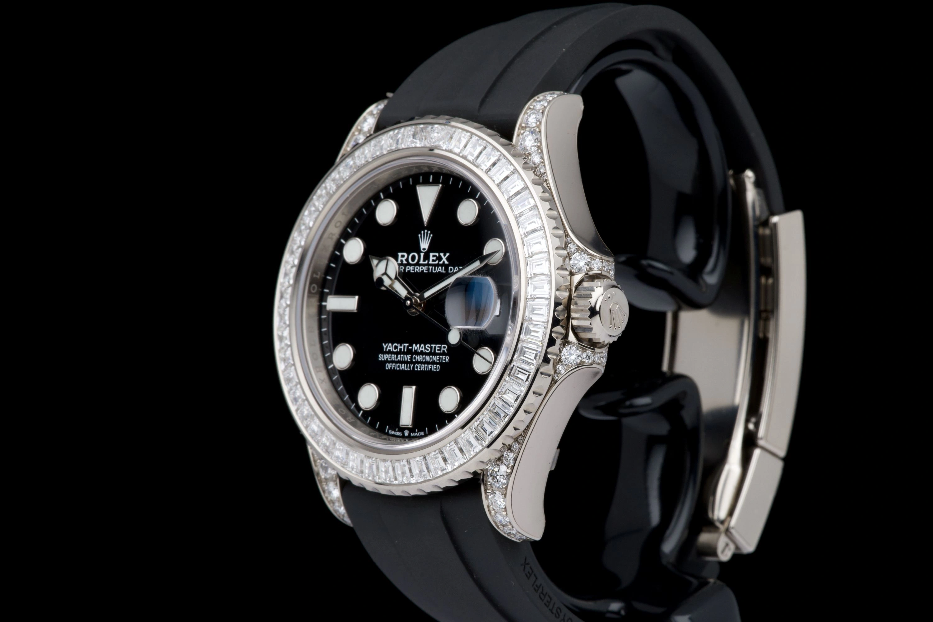 Rolex Yacht-Master 42 Baguette Ref. 226679TBR . This baguette diamond set version of the Yacht-Master was revealed in 2021, an off-catalogue model adorned with around 50 baguettes diamonds on the rotating bezel and more on the lugs and around the crown.