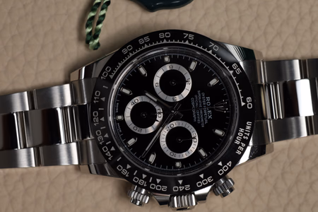 Introduced at BaselWorld 2016, the Rolex Daytona 116500ln-0001 features a stainless steel case and a black ceramic bezel. Reference 116500ln-0002 is similar though fitted with a black dial. This Oyster Perpetual Cosmograph Daytona in Oystersteel with a black dial and an Oyster bracelet, features a black Cerachrom bezel with tachymetric scale.