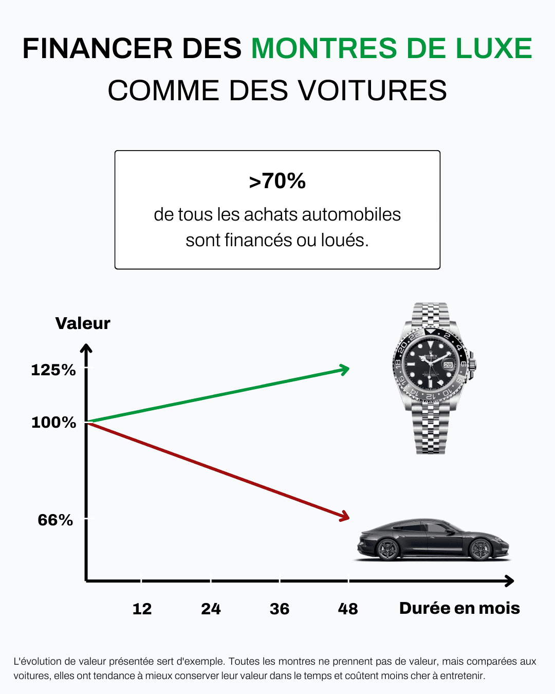 La possibilité de financer une montre ou un produit de luxe constitue une méthode de paiement supplémentaire qui n'est guère proposée aujourd'hui. En finançant la montre, un client peut effectuer l'achat avec son revenu mensuel régulier. S'il est possible de financer une voiture, pourquoi pas une montre?
