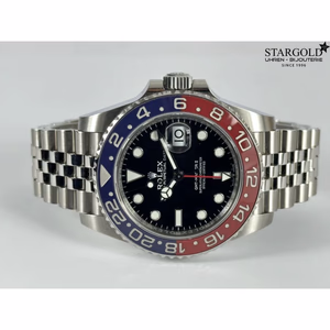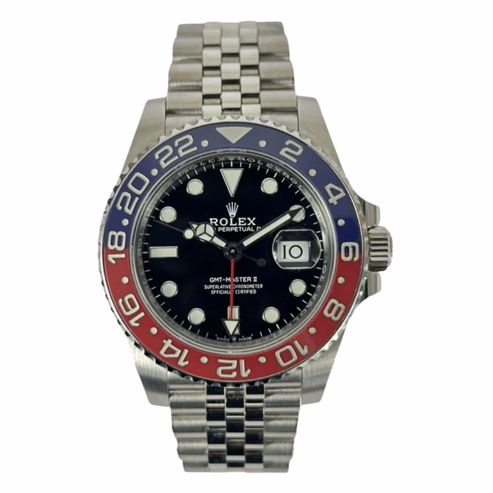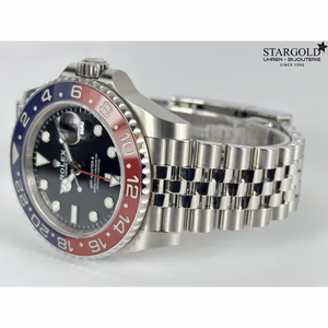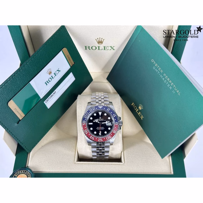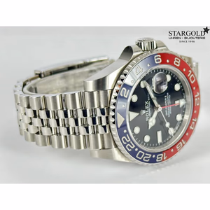 The Rolex GMT-Master 126710 was introduced at BaselWorld 2018. It features a Pepsi bezel insert in ceramic, a jubilee bracelet, and the new caliber 3285. Functions: Centre hour, minute and seconds hands. 24-hour display. Second time zone with independent rapid-setting of the hour hand. Instantaneous date. Stop-seconds for precise time setting. Bezel: Bidirectional rotatable 24-hour graduated bezel. Two-colour red and blue Cerachrom insert in ceramic, moulded numerals and graduations, Clasp: Folding Oysterlock safety clasp with Easylink 5 mm comfort extension link