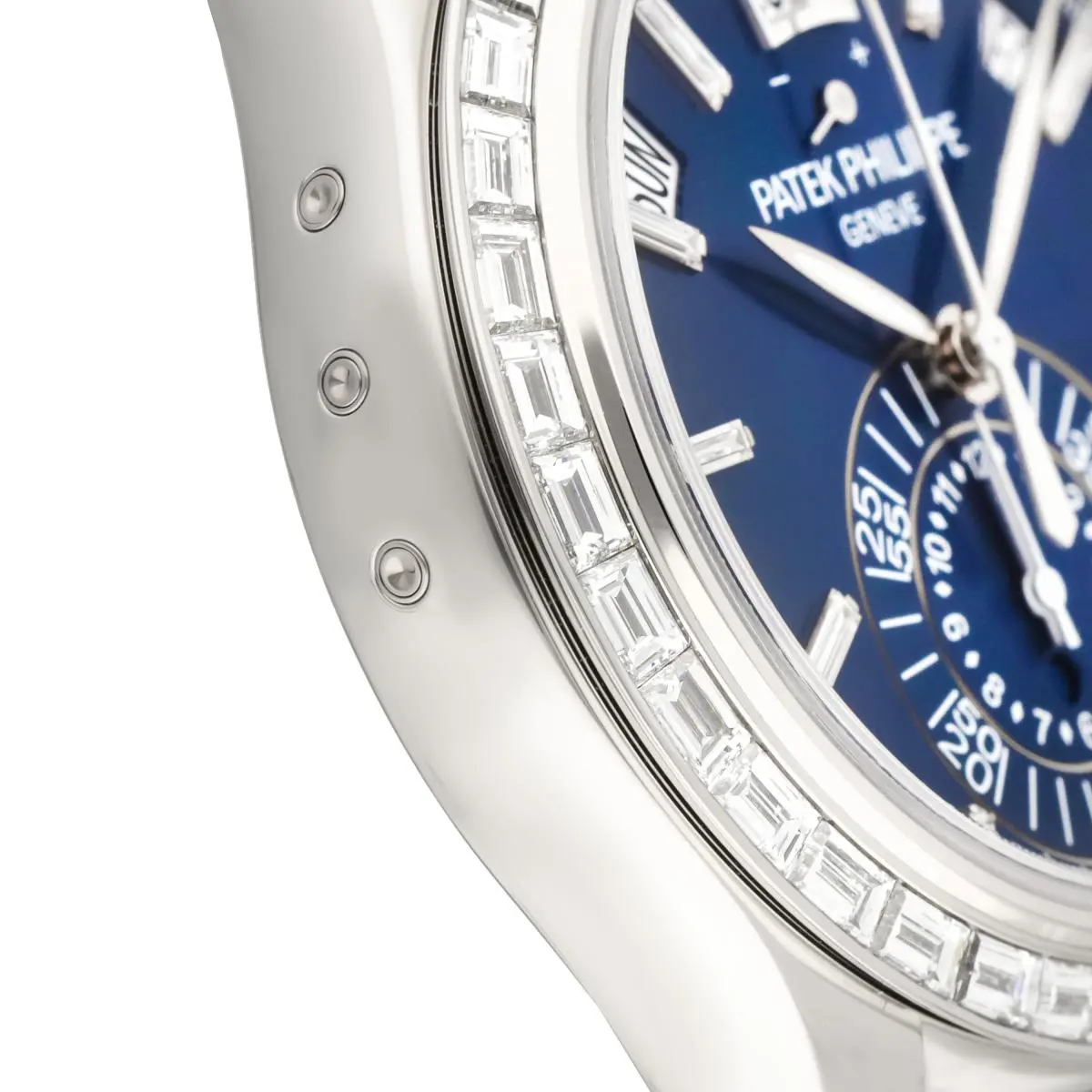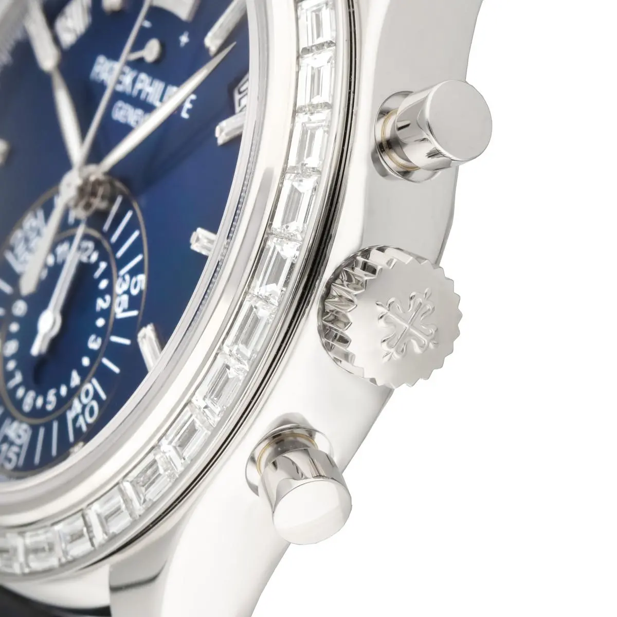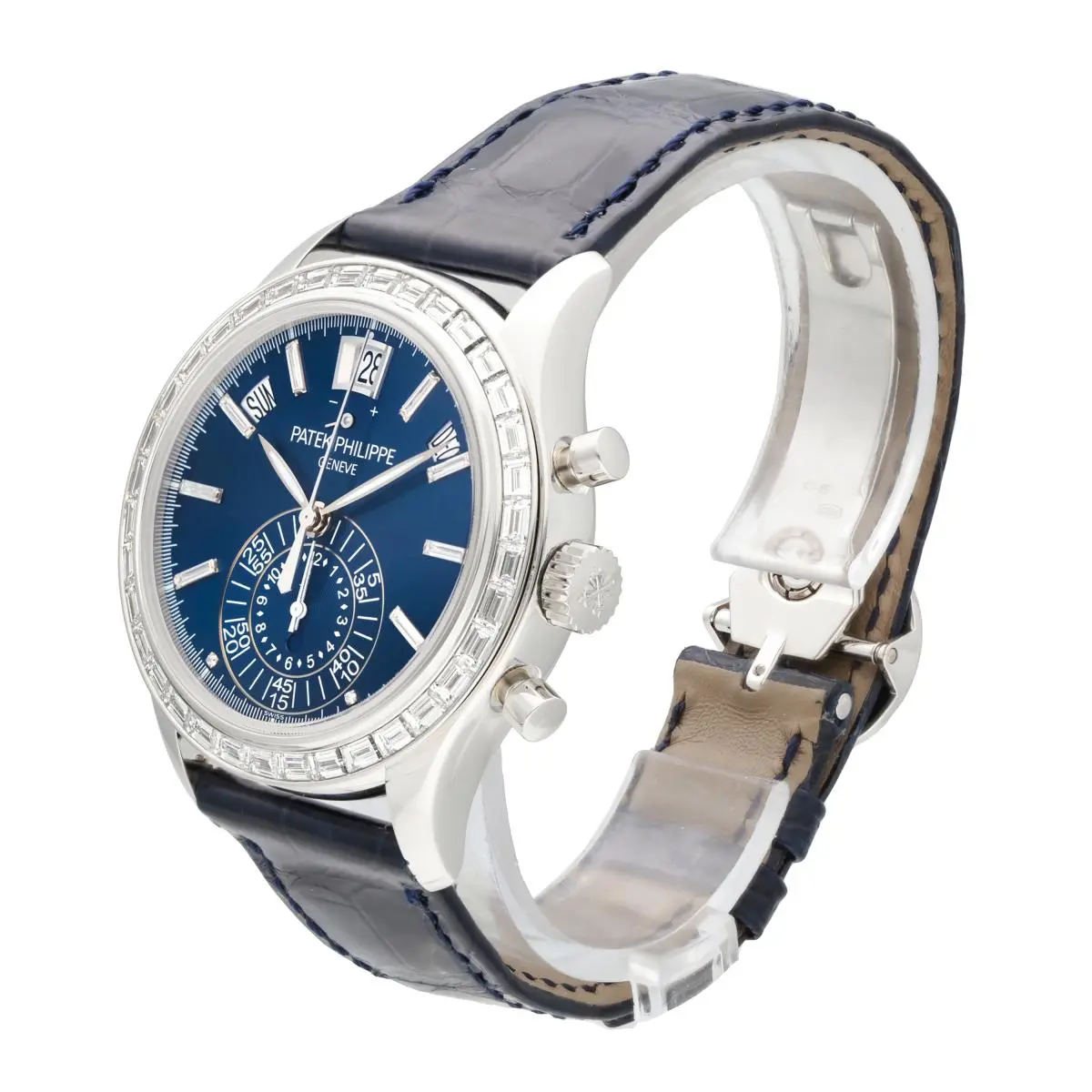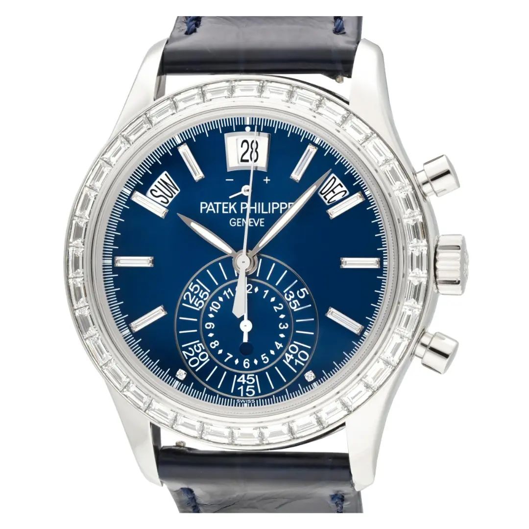 Patek Philippe Complications Annual Calendar Chronograph Ref. 5961P-001 features a bezel set with 36 baguette diamonds (~3.48 ct.). and a The matte blue dial features 8 diamond hour markers (~0.23 ct.), while the fold-over clasp is set with 22 baguette diamonds (~0.97 ct.). Introduced at BaselWorld in 2011.