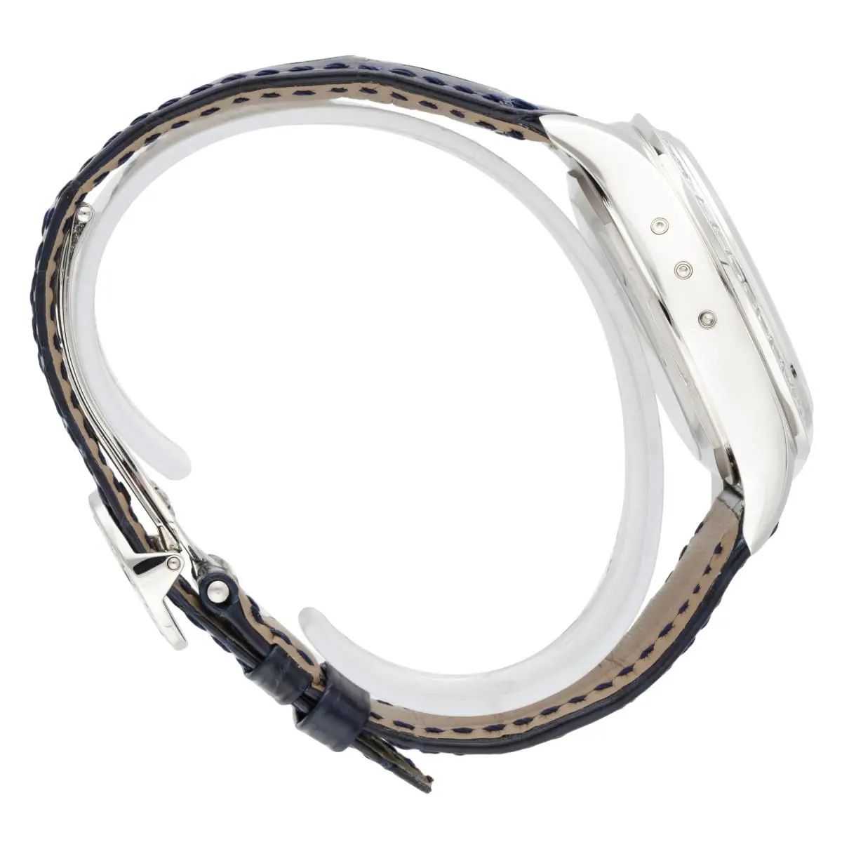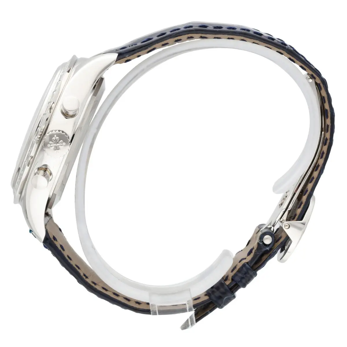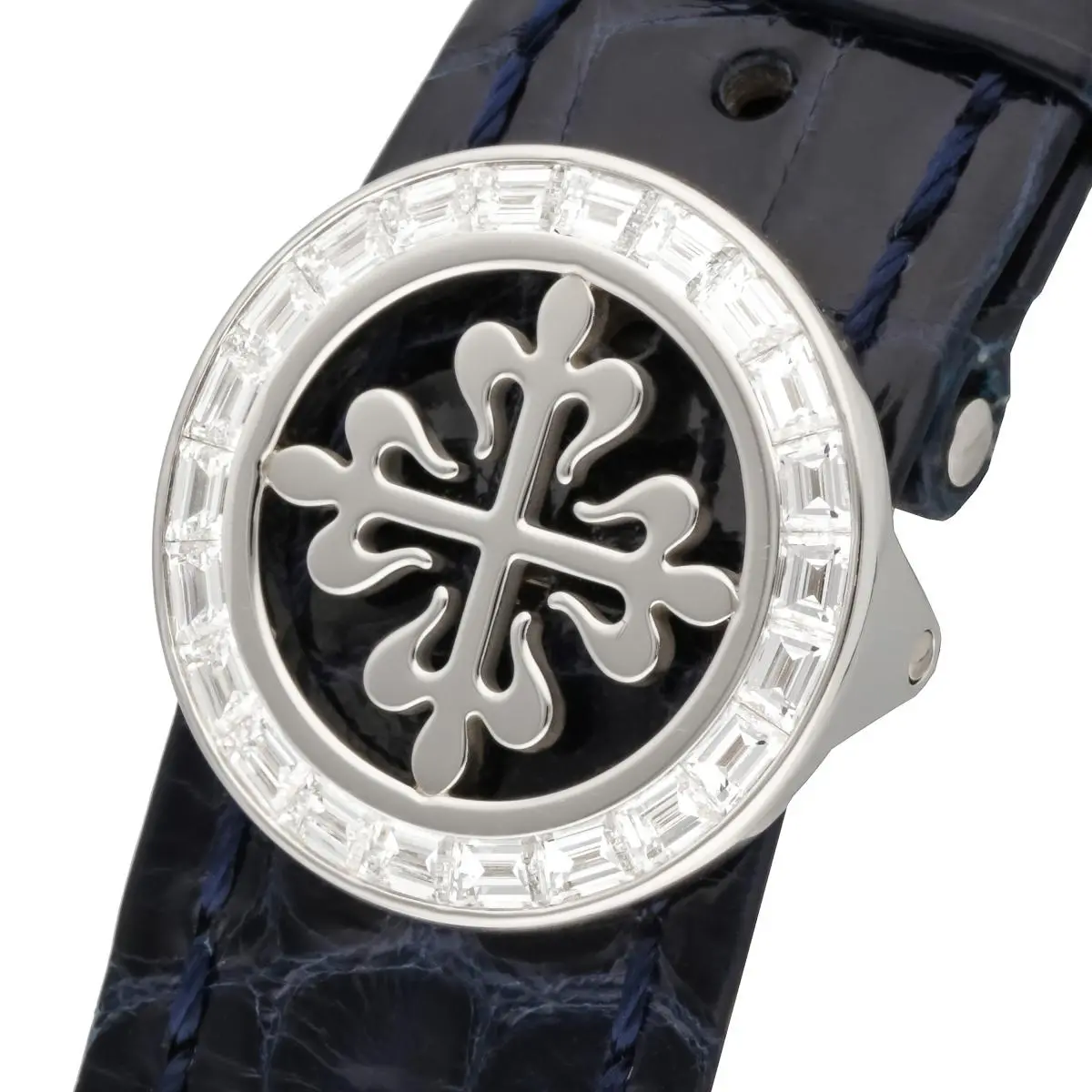 Patek Philippe Complications Annual Calendar Chronograph Ref. 5961P-001 features a bezel set with 36 baguette diamonds (~3.48 ct.). and a The matte blue dial features 8 diamond hour markers (~0.23 ct.), while the fold-over clasp is set with 22 baguette diamonds (~0.97 ct.). Introduced at BaselWorld in 2011.