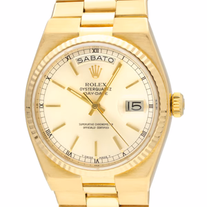 The Rolex Day-Date Oysterquartz with a 36mm diameter comes in different dial variations. Rolex Day-Date OysterQuartz ref 19018 is a product of what the watchmaking community refers to as the "Quartz Crises." The OysterQuartz was Rolex's answer to the crises. It features classic Rolex design but is powered by a Rolex calibre Quartz movement.