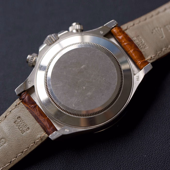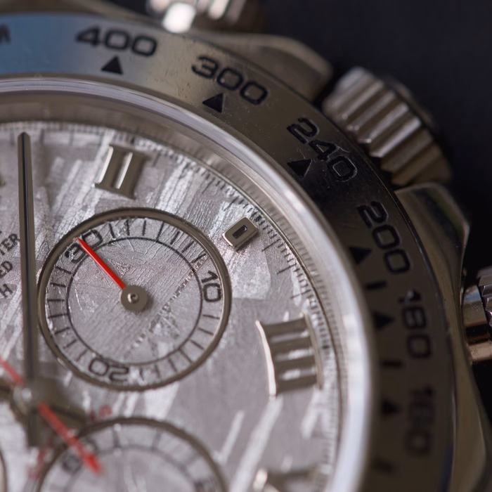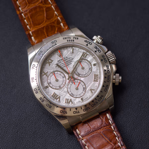 The Rolex Daytona, ref. 116519, with meteorite dial is a rare and luxurious version of the famous chronograph. It features a 40 mm 18-carat white gold case