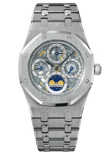 The Royal Oak Perpetual Calendar -Quantième Perpétuel- is a complicated take on AP's iconic luxury sports watch. With the first iteration being introduced in 1983, it can be seen as a trailblazer for the complicated 'sports' watch genre. Reference 25829PT.OO.0944PT.01 has a platinum case and matching bracelet. Its sapphire dial reveals parts of its caliber 2120 / 2802 mvoement.