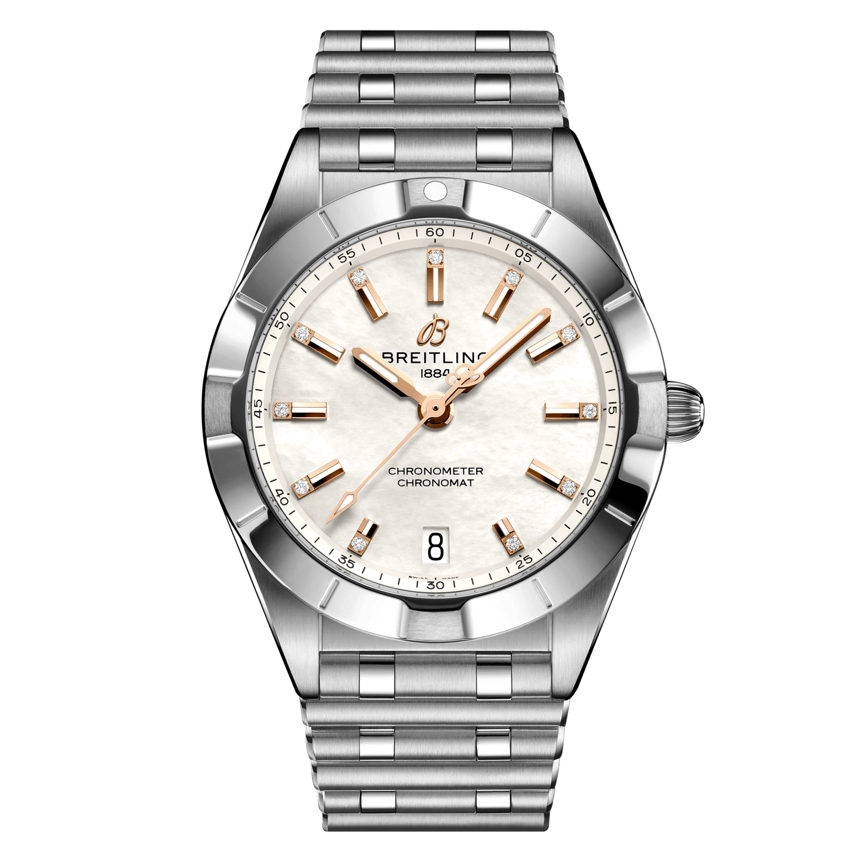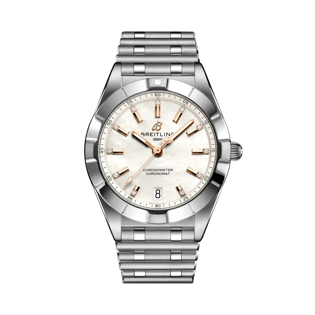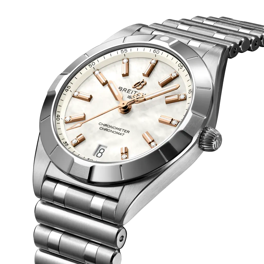 Breitling Chronomat 32 Ref. A77310101A4A1. Stylish yet elegant, the modern-retro inspired Chronomat 32 is the versatile sporty and chic watch for any occasion. It is available in an array of metal cases, from cool stainless steel, to goes-with-everything bicolor, or even luxurious 18k red gold. Women craving extra sparkle will also be able to opt for diamond-set bezels, indices, and colorful dials. Featuring Breitling’s iconic and comfortable “Rouleaux” bracelet with a butterfly clasp.