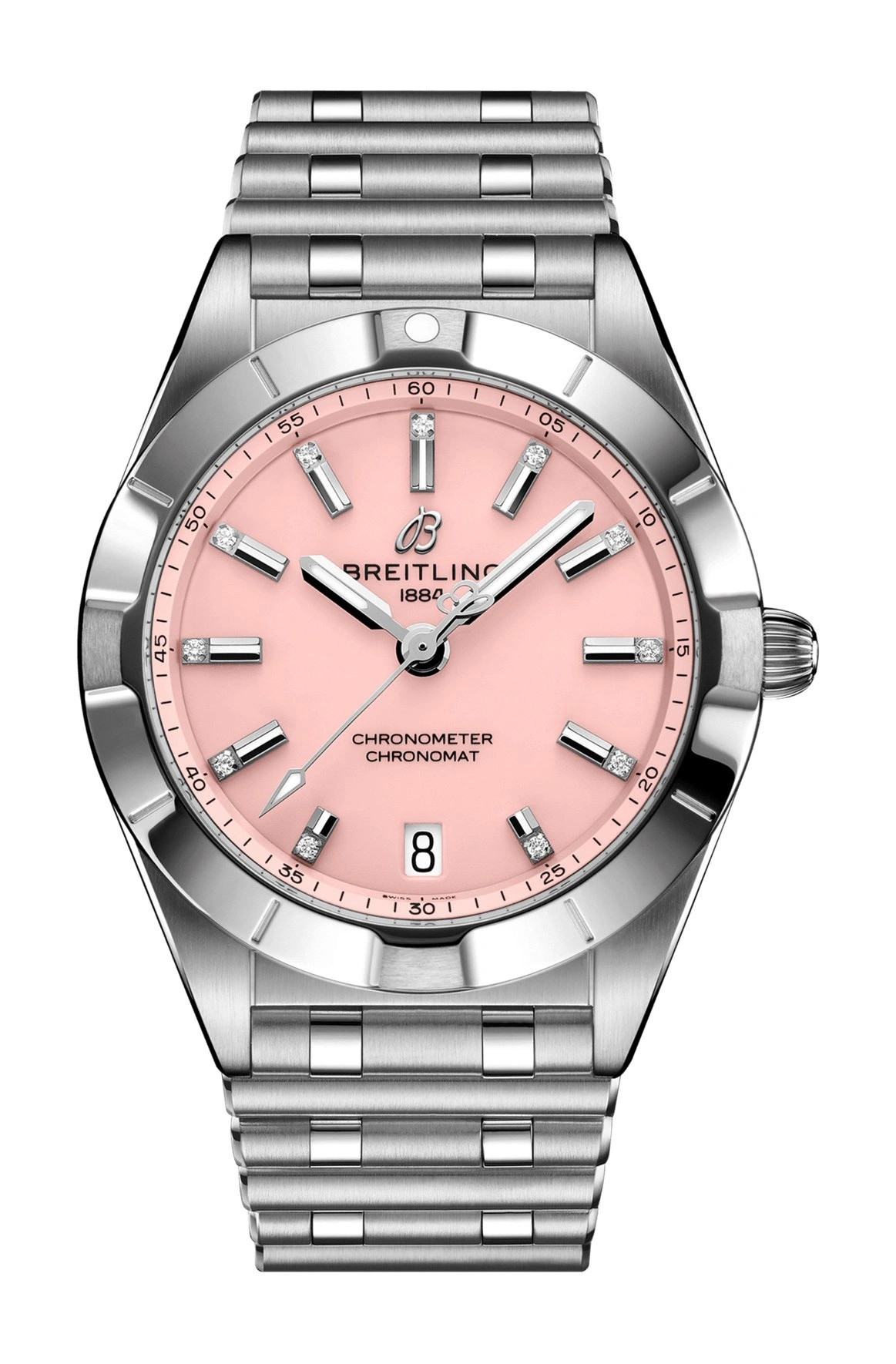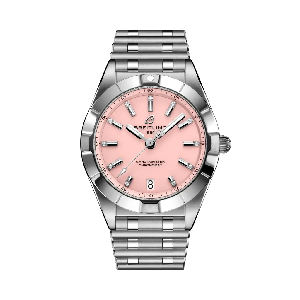 The Breitling Chronomat Automatic 32 reference A77310101K1A1 has a stainless steel case paired with a matching Rouleaux bracelet. The dial is Pink. Inside ticks the SuperQuartz caliber Caliber 77.