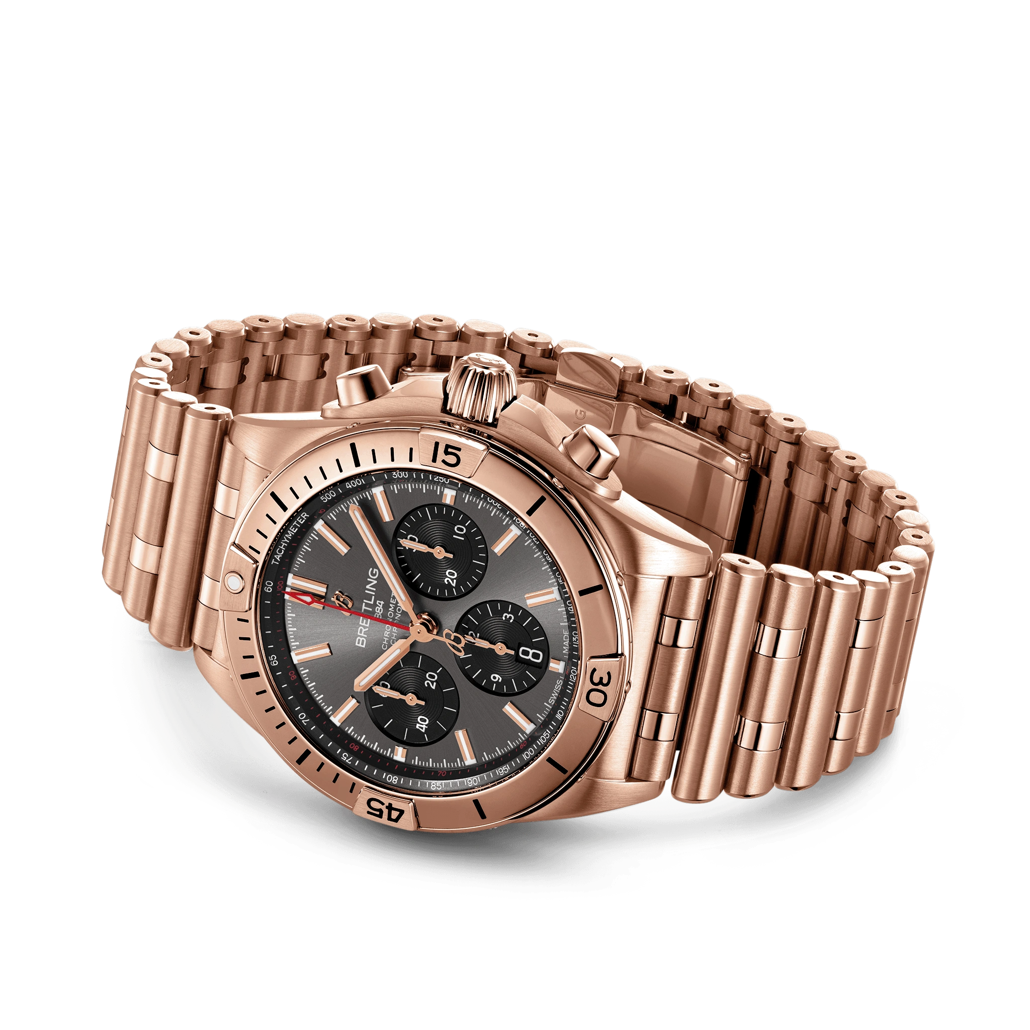 The Breitling Chronomat B01 42 was introduced in 2020. A complete revamp of Breitling's evergreen, this new version sports a sleeker case with more clearly defined angles, a redesigned bezel, and the option of a brand-new 'Rouleaux' style bracelet. Inside ticks Breitling's in-house B01 movement. Reference RB0134101B1R1 has a red gold case and a Grey dial.