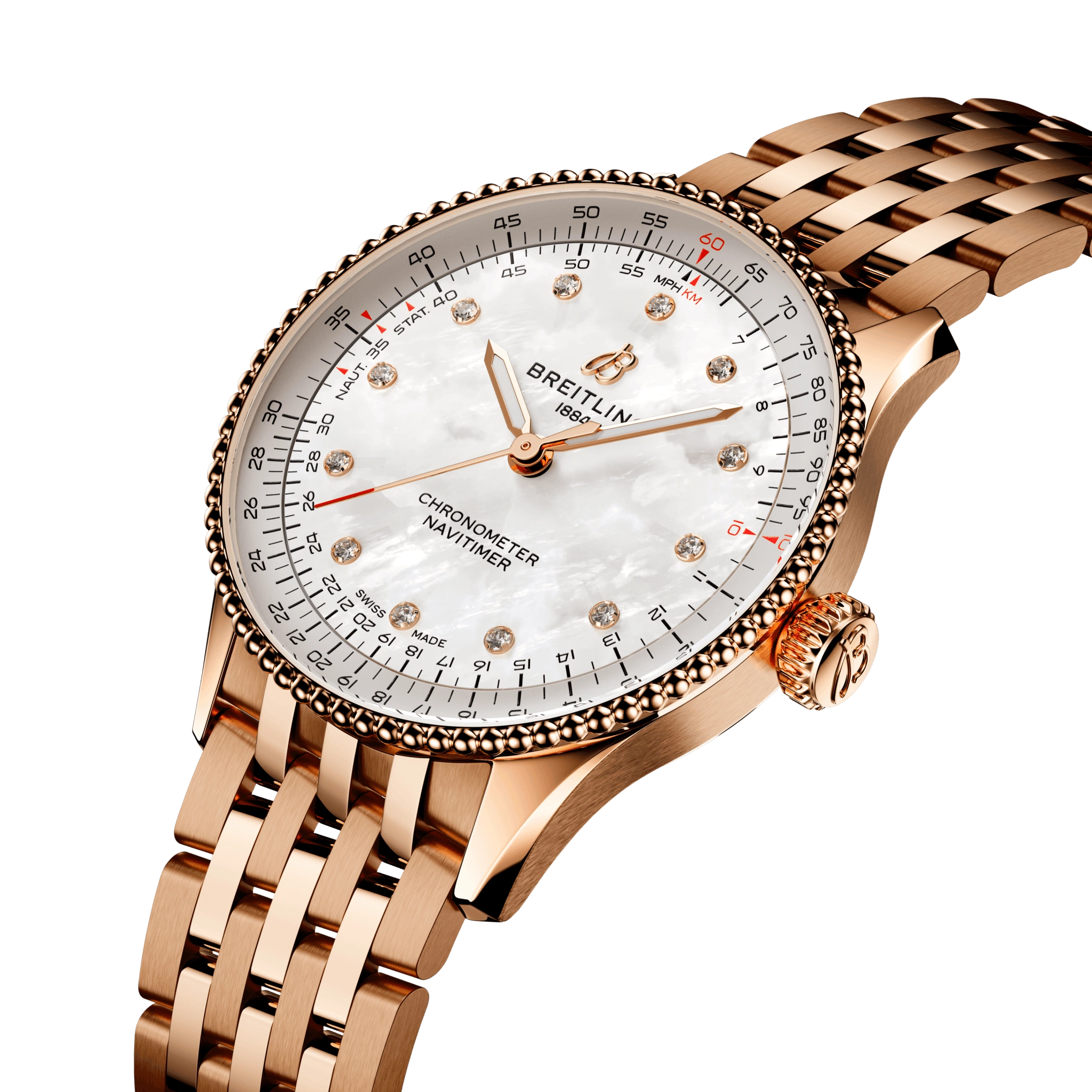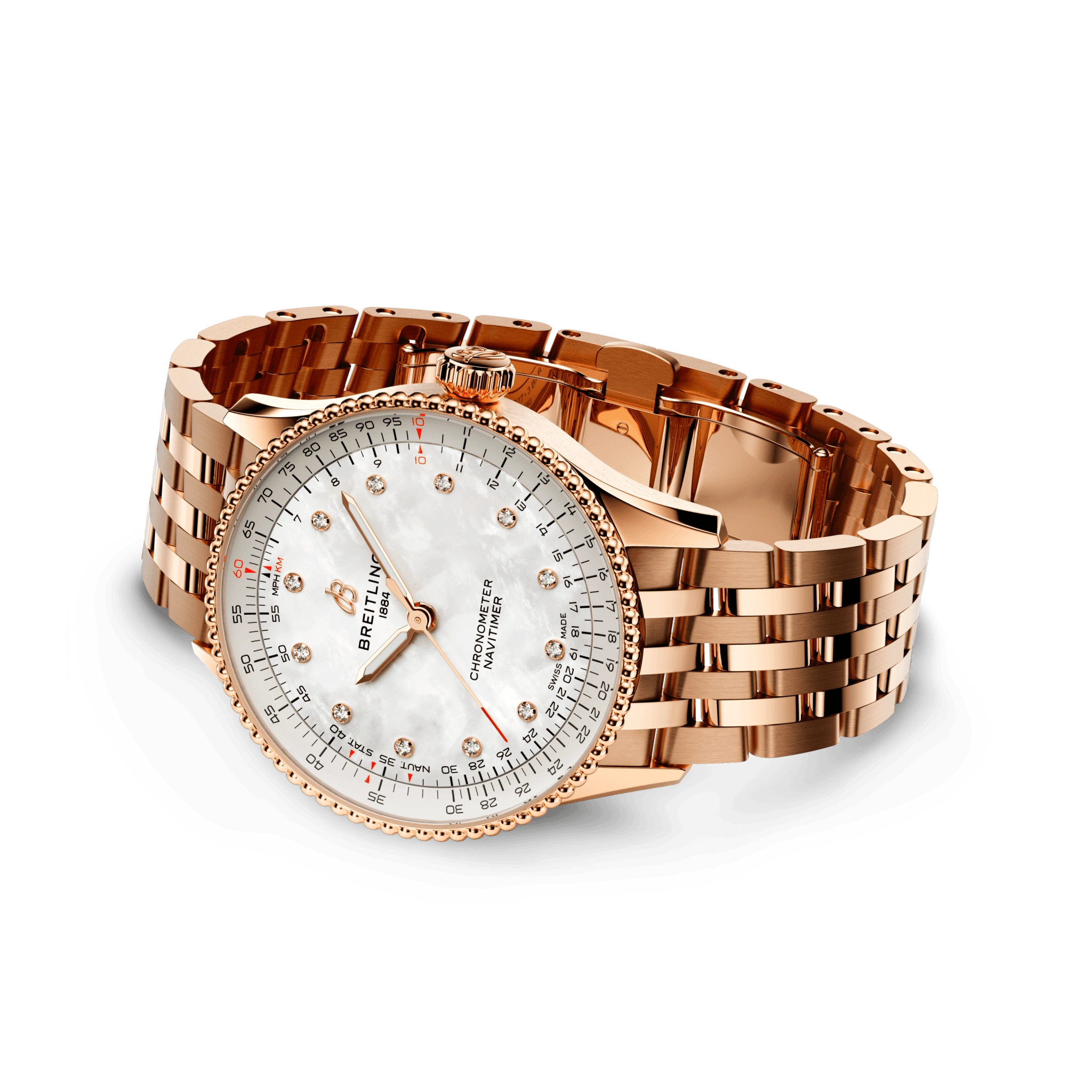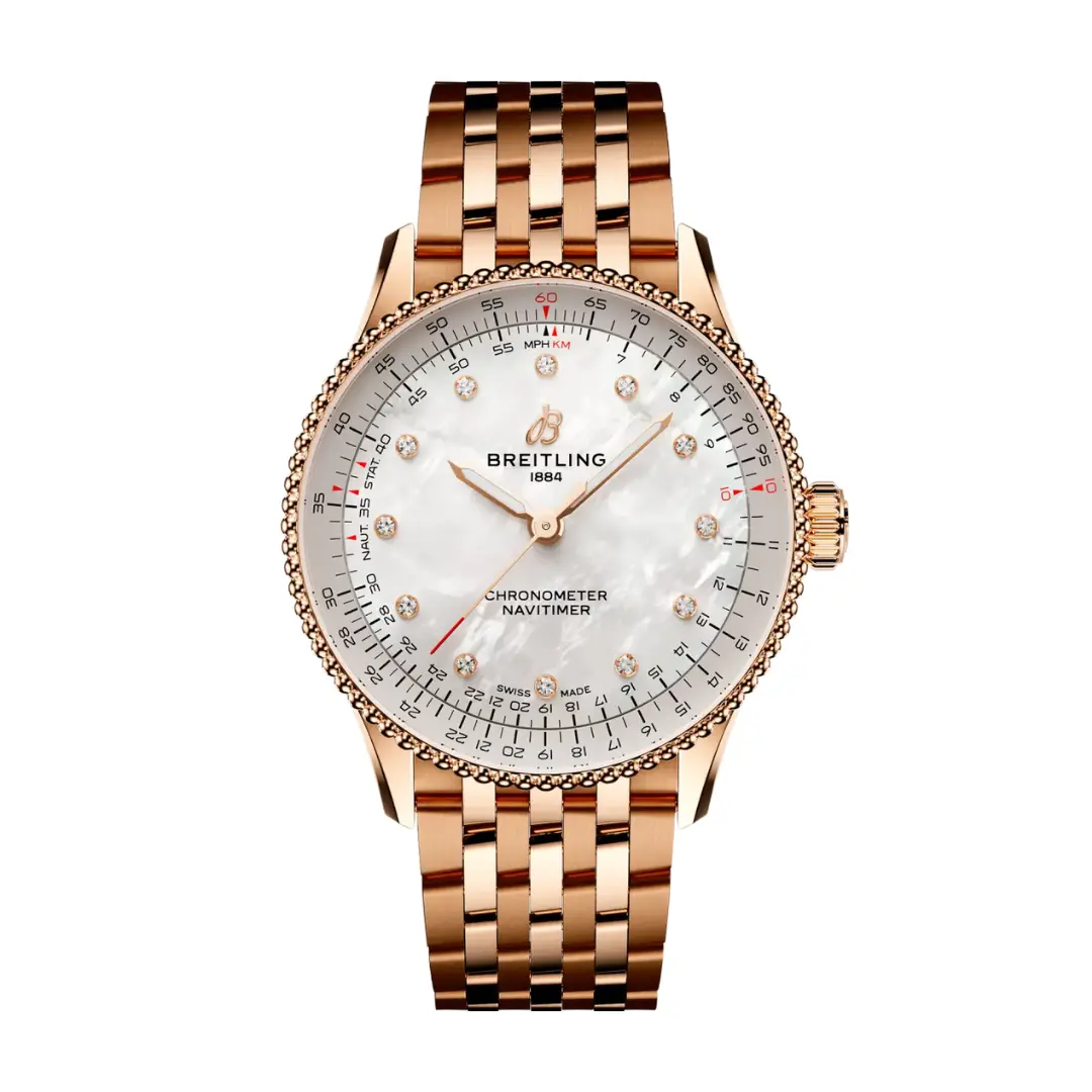 The Breitling Navitimer Automatic 36 R17327211A1R1 debuted in 2023. This Navitimer has a red gold case of 36.00mm, which houses the self-winding caliber Caliber 17 ND. The dial is White mother-of-pearl with diamond-set hour markers. Our icon now comes in 36 and 32 mm sizes for women and men who love the look and feel of a smaller diameter watch. While the 36-mm Navitimer features the beaded bezel and iconic circular slide rule that gives the Navitimer its unmistakable appearance, the dazzling 32 mm variation forgoes the slide rule in favor of a simplified dial design suited to its slim diameter.