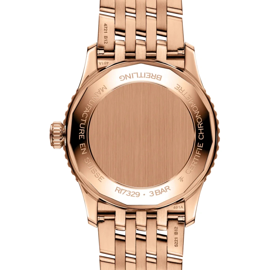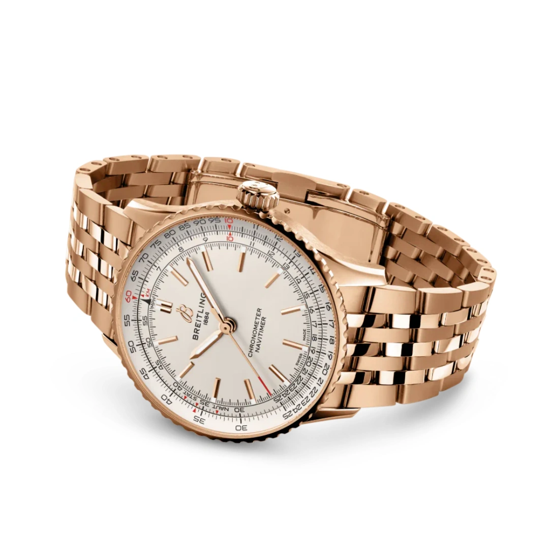 The Breitling Navitimer Automatic 41 R17329F41G1R1 was introduced in 2024.. The case - in red gold - measures 41mm across, housing the self-winding caliber B17. The dial is Silver. The Navitimer Automatic and Automatic GMT 41 distill the iconic look, omitting the chronograph yet preserving a balanced dial composition. The central placement of the 24-hour scale on the GMT and the Automatic’s clean face, ensure the intricate slide rule stands out while streamlining the overall aesthetics.