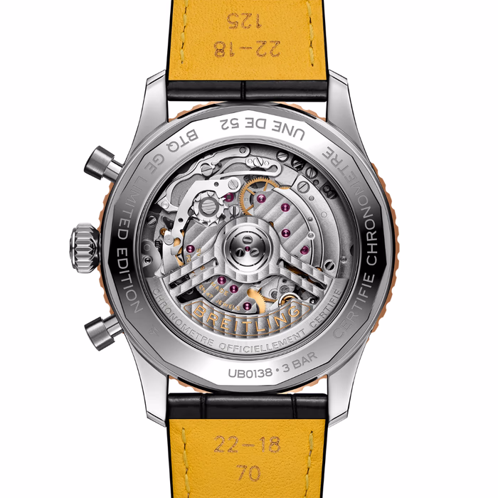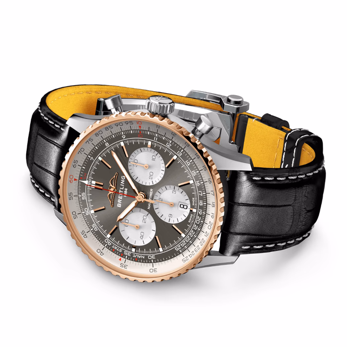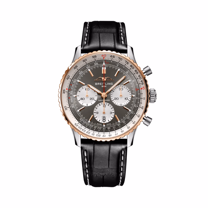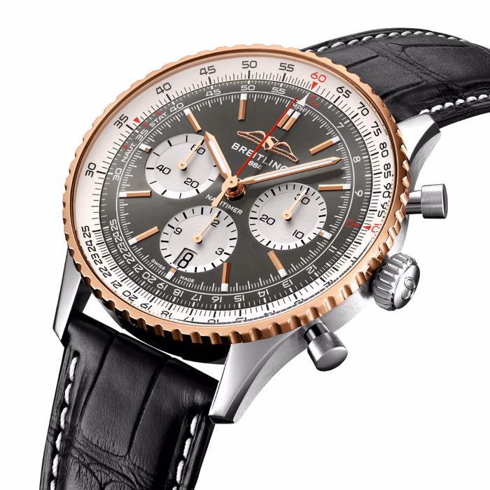 Breitling Navitimer Chronograph 43 Limited Ref. UB01383A1M1P1. There have been many iterations of Breitling’s icon since its debut 70 years ago, but this new Navitimer captures its most classic features, while enhancing them with modern refinements. A flattened slide rule and a domed crystal create the illusion of a sleeker profile. Alternating polished and brushed metal elements give a lustrous, yet understated finish.
