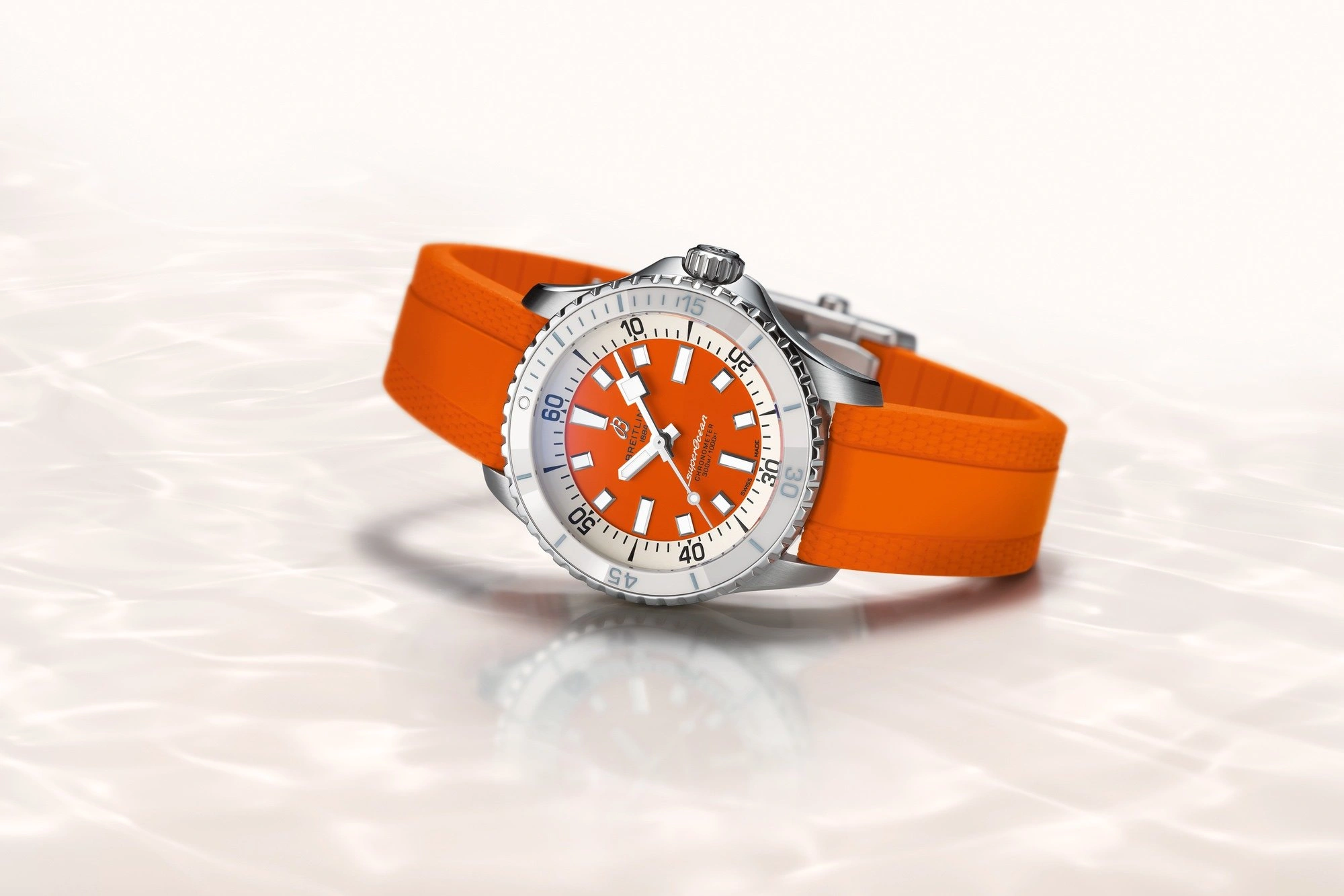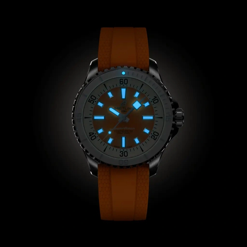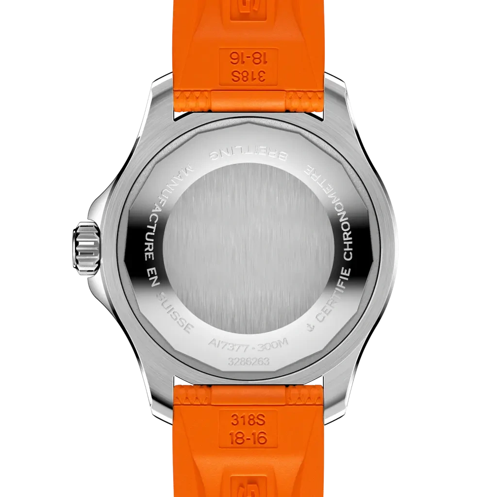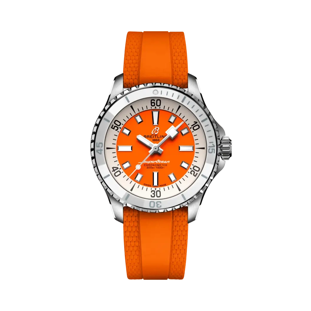 The Breitling SuperOcean Automatic A17377211O1S1 debuted in 2022 as part of a renewed SuperOcean collection inspired by the 'Slow Motion' of the 1960's. This version has a case of 36.00mm with a ceramic bezel insert, and a Orange dial. The movement within is Breitling's trusted caliber Caliber 17 ND.