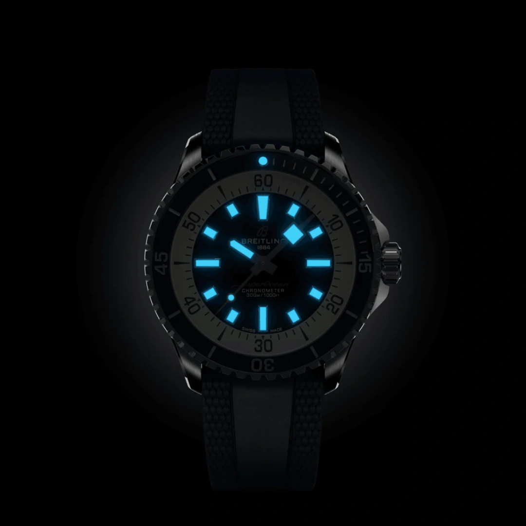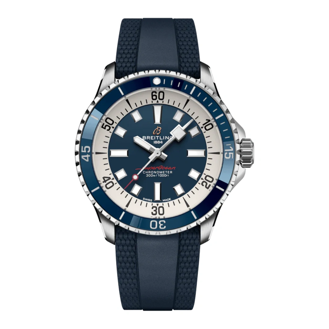 The Breitling SuperOcean Automatic A17375E71C1S1 debuted in 2022 as part of a renewed SuperOcean collection inspired by the 'Slow Motion' of the 1960's. This version has a case of 42.00mm with a ceramic bezel insert, and a Blue dial. The movement within is Breitling's trusted caliber Caliber 17 ND. Performance and style for all your water-based pursuits. In the 1960s, the new sport of scuba diving was all the rage. For divers, timing was everything, and Breitling set out to give them the most clear-cut dive watch possible by eliminating any feature that didn’t support their lifesaving needs underwater.