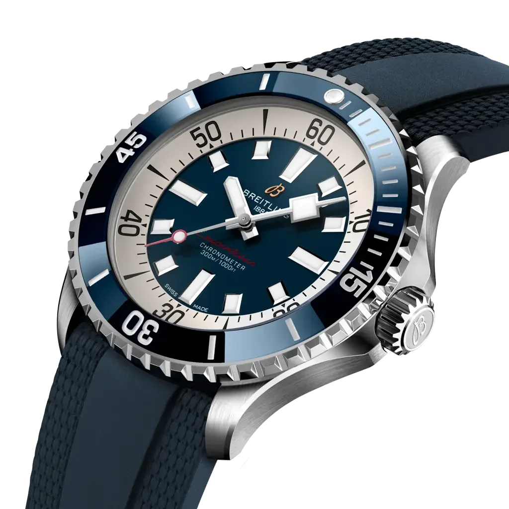 The Breitling SuperOcean Automatic A17378E71C1S1 debuted in 2022 as part of a renewed SuperOcean collection inspired by the 'Slow Motion' of the 1960's. This version has a case of 46.00mm with a ceramic bezel insert, and a Blue dial. The movement within is Breitling's trusted caliber Caliber 17 ND.