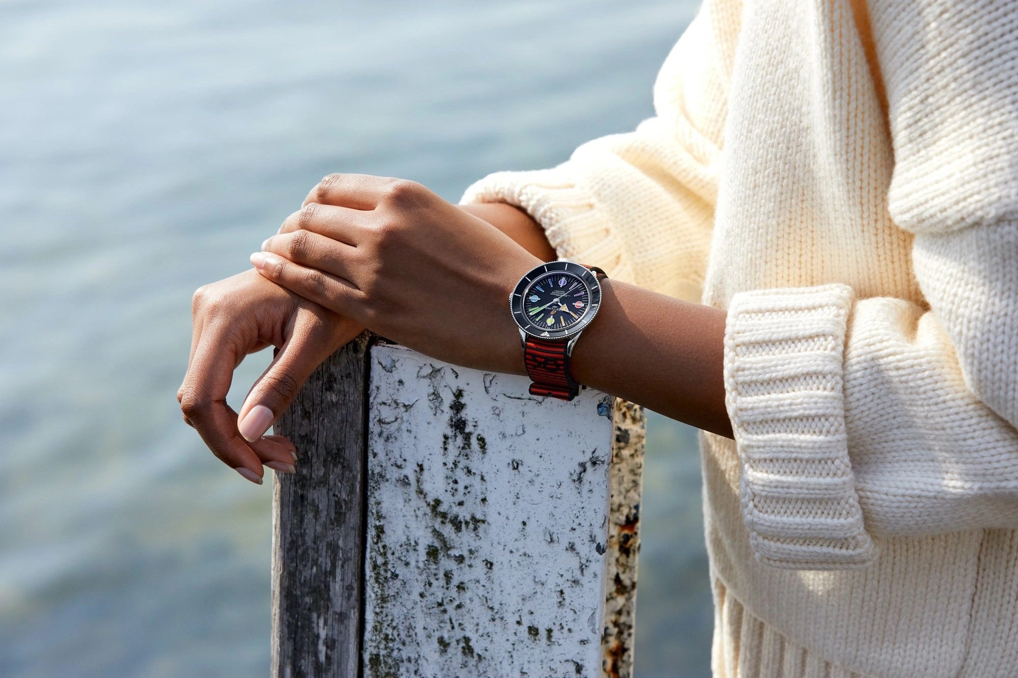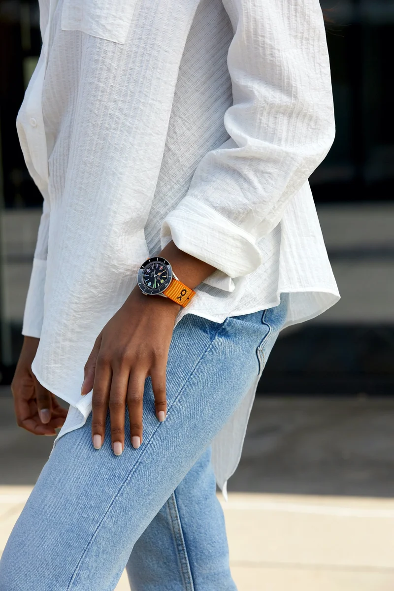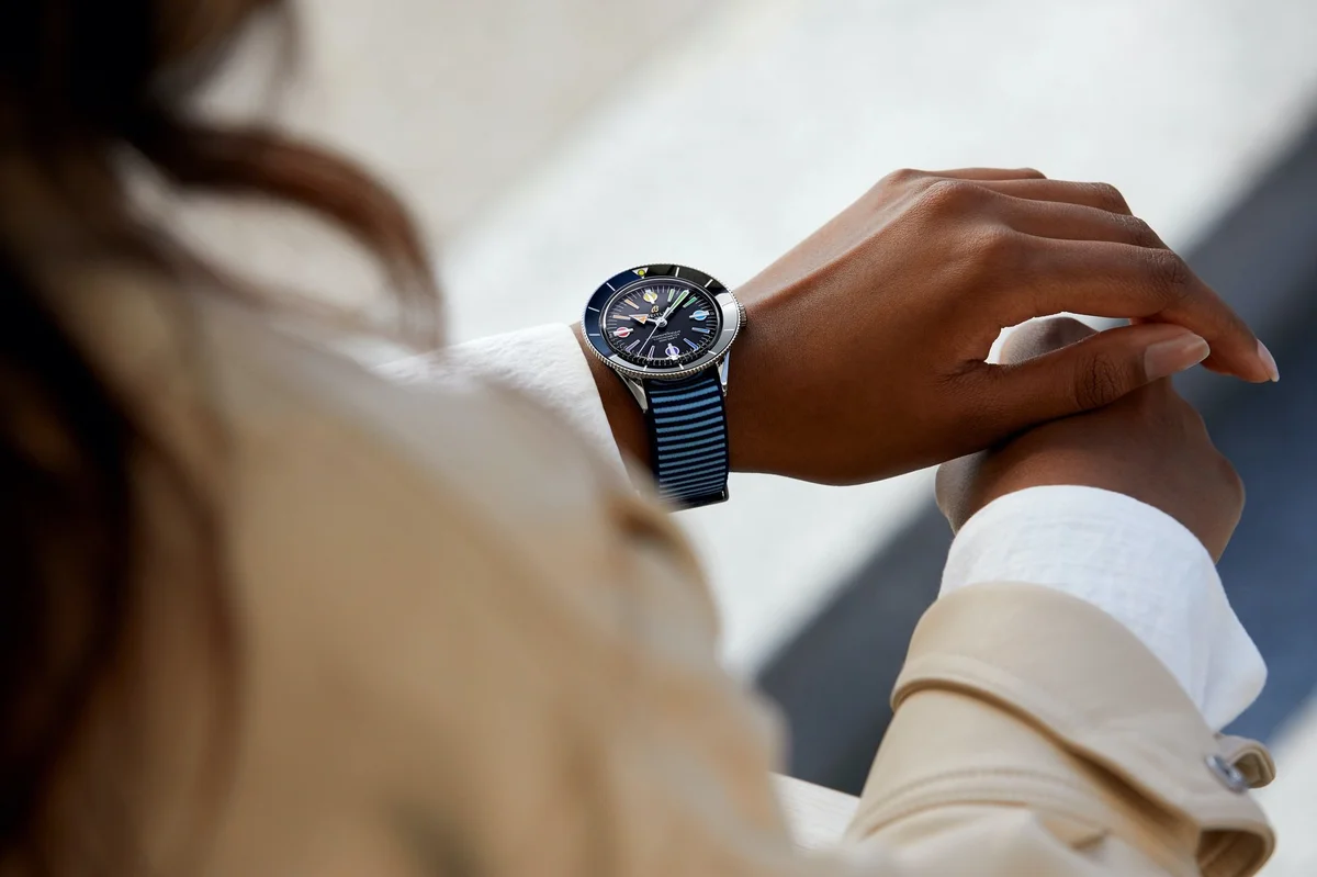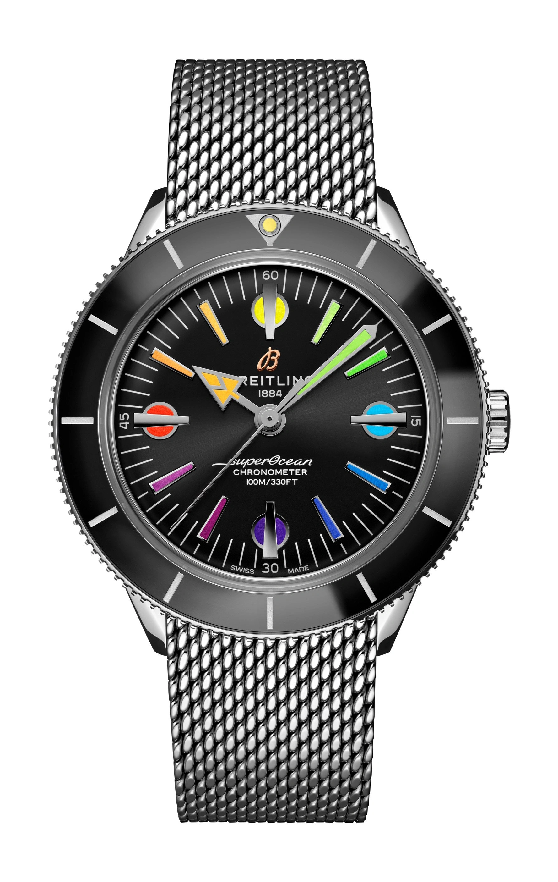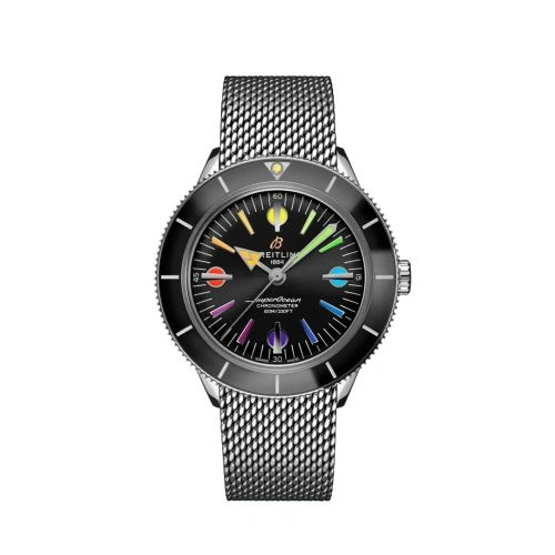 The Breitling Superocean Heritage '57 was introduced in 2020 as a modern take on the original 1957 Breitling Superocean. Cues from its source of inspiration include the unusual hour markers and the inclined bezel - though the latter is now done in ceramic. Its case measures 42mm across, holding a caliber B10 movement. Water resistance is set at 100 meters. The Superocean heritage '57 is available in a number of variations. Reference A103701A1B1A1 is a limited edition of 250 pieces exclusive to Breitling Boutiques. It features a black dial with rainbow markers inspired by the bright colors of the hippie-era.